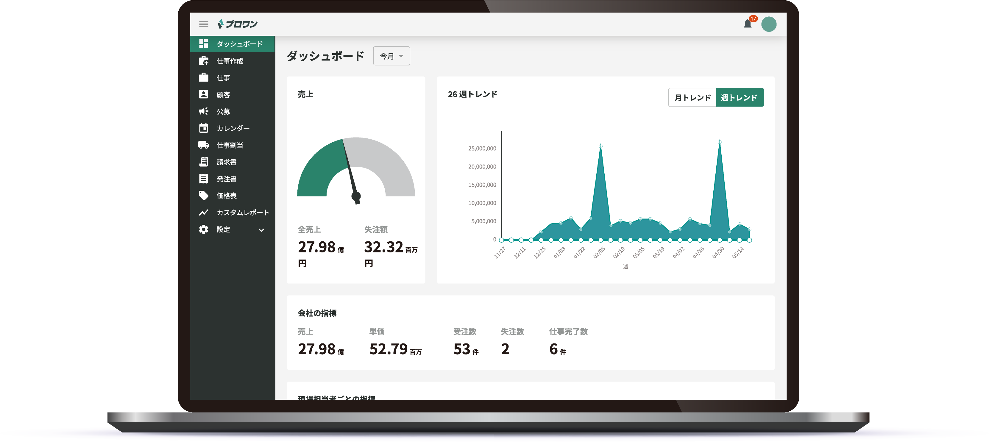 生産性向上・売上アップ・顧客満足度向上を実現する、短期工事やリフォーム・設備工事など現場事業者向けの業務支援ソフトウェアです。見積もり作成はもちろん顧客管理、営業支援、日報・工事書類の作成や分析レポートの作成、収支管理まで、現場に向き合う事業者の業務をオールインワンでサポートします。