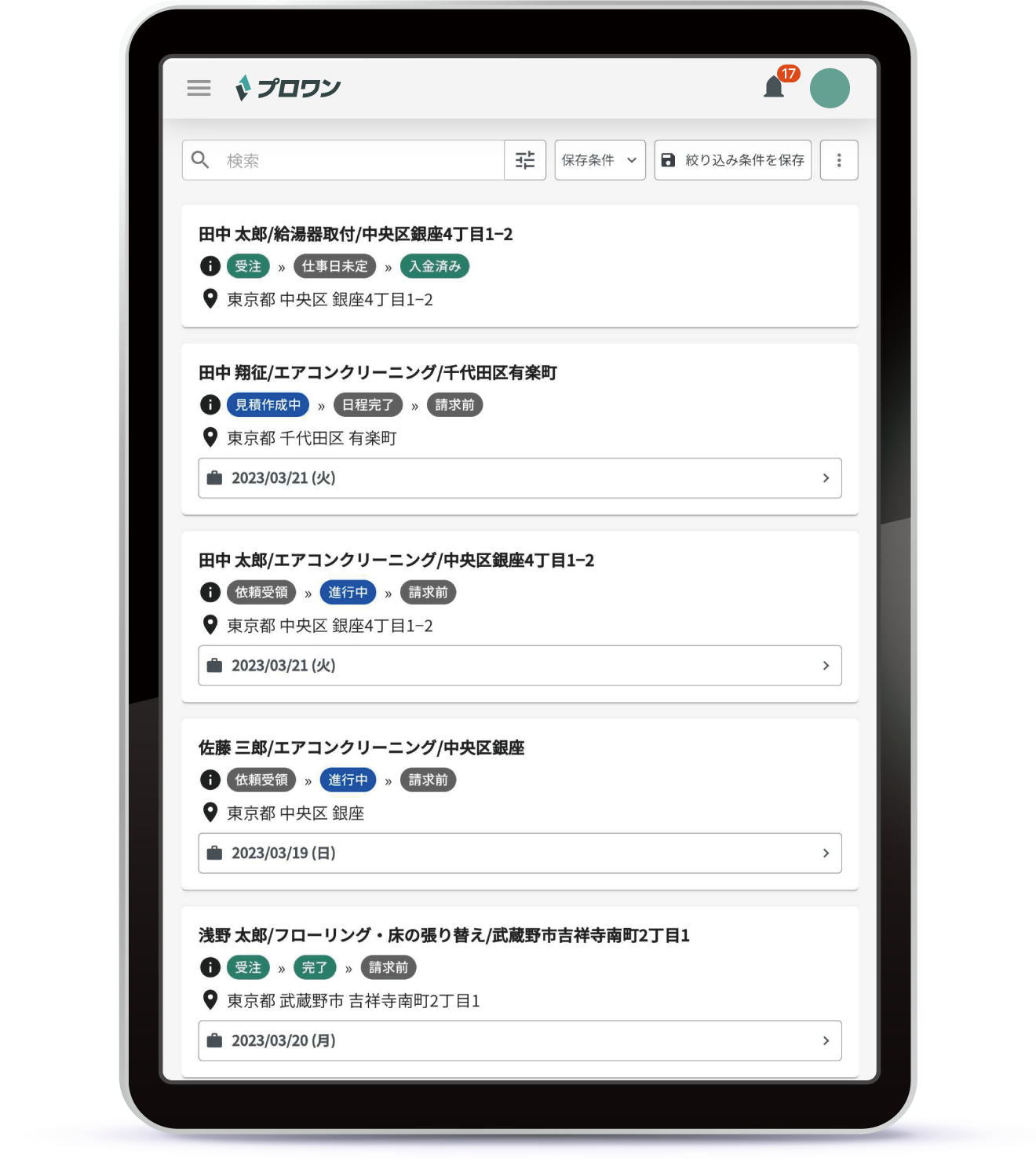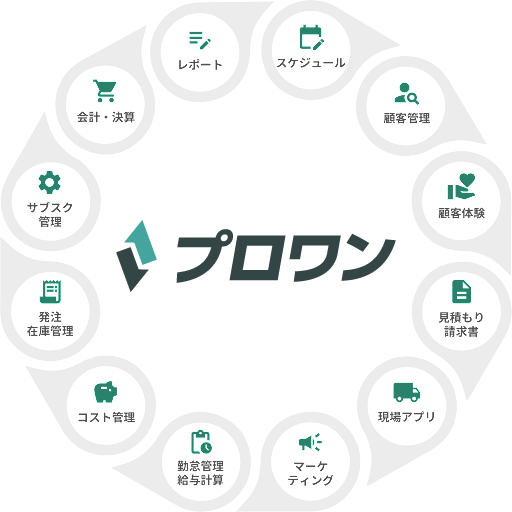 ミツモアが開発・提供する「プロワン」は、国内初の短期工事やリフォーム・設備工事など現場仕事の業務支援に特化したオールインワンのソフトウェアです。顧客管理・営業支援・差配・分析レポート・収支管理等、現場からバックオフィスまでさまざまな業務を自動化し、一元管理することが可能です。現場で働く従業員は、作業後、オフィスに戻ることなくその場でタブレットにて見積もりや請求書、完了報告などの書類を作ることができるため、顧客対応のスピードアップや業務効率化を図ることが可能となります。結果として従業員の残業時間の大幅削減や顧客満足度向上が叶うなど、「プロワン」は、現場事業者の事務作業30%減、売上20%増を実現するサービスです(※当社調べ)。
