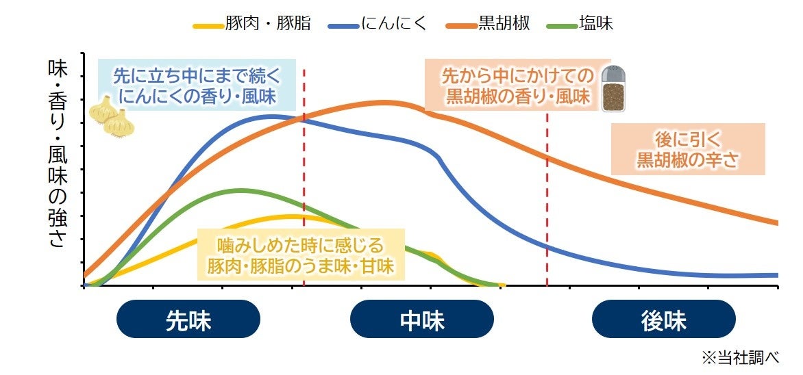 定番「ギョーザ」と比較して約3倍※入ったにんにくと、黒胡椒の辛味や塩味、豚肉のうま味と中具のジューシー感が、すっきりとしたのどごしのビールに最適な味わいです(※当社調べ)。下図の通り、噛んだ瞬間にんにくの香りと風味が口内を駆け抜け、噛むごとに豚肉の脂とうま味が口いっぱいに広がり、黒胡椒の刺激を最後まで感じることができます。