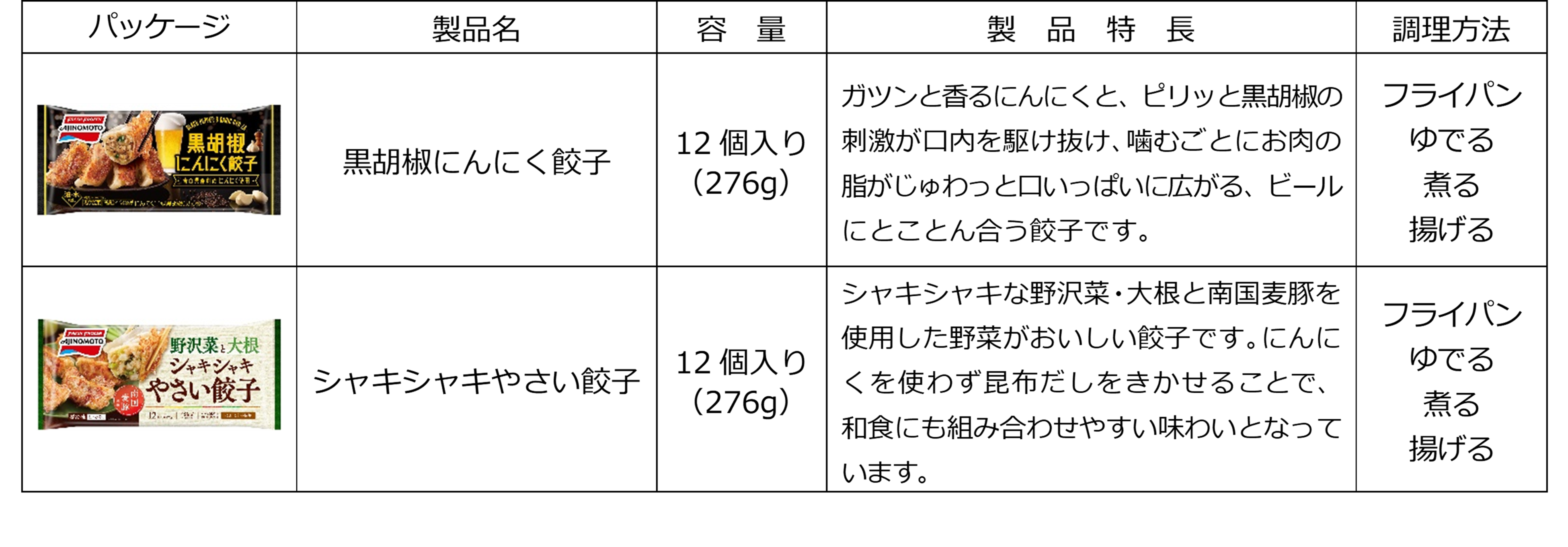 味の素冷凍食品(株)から、ビールと和食それぞれに合った2つの餃子が新発売!「黒胡椒にんにく餃子」「シャキシャキやさい餃子」