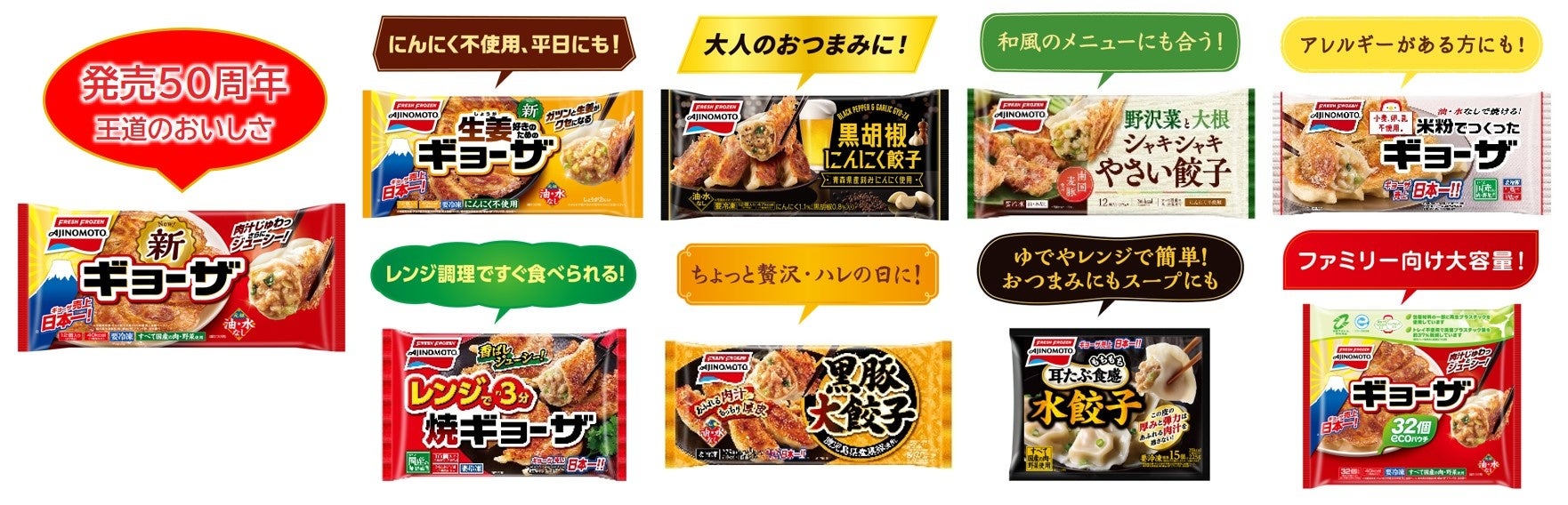 冷凍餃子は、生活者が初めて使う冷凍食品として、1番多くの方に食べていただいているカテゴリー※です(※冷凍調理新規層の主要サブカテゴリー別購入率推移(%)、当社調べ)。そして、当社は『餃子が大好きなすべての人に最高の笑顔をお届けしたい』という想いから、お客様の多様なニーズにお応えして、製品のラインナップを 展開しています。今後も当社は、“永久改良”を続けながら、冷凍食品を通じて、食べる人、使う人に「感動」と「喜び」をお届けしていきます。