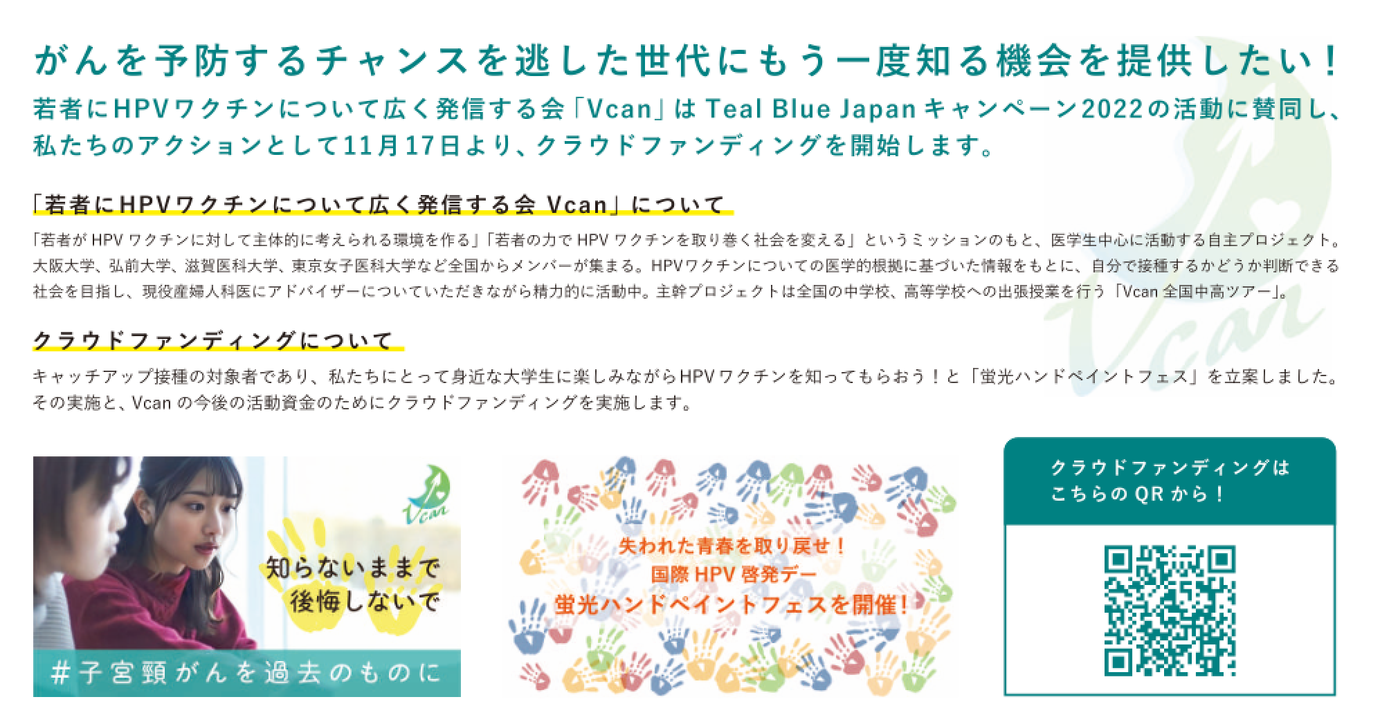 若者にHPVワクチンについて広く発信する会 「Vcan」では、Teal Blue Japanキャンペーン2022に賛同し、自主アクションとして、国際HPV啓発デーとなる、2023年3月4日に啓発イベントを企画。2022年11月17日よりクラウドファンディングをスタートしました。