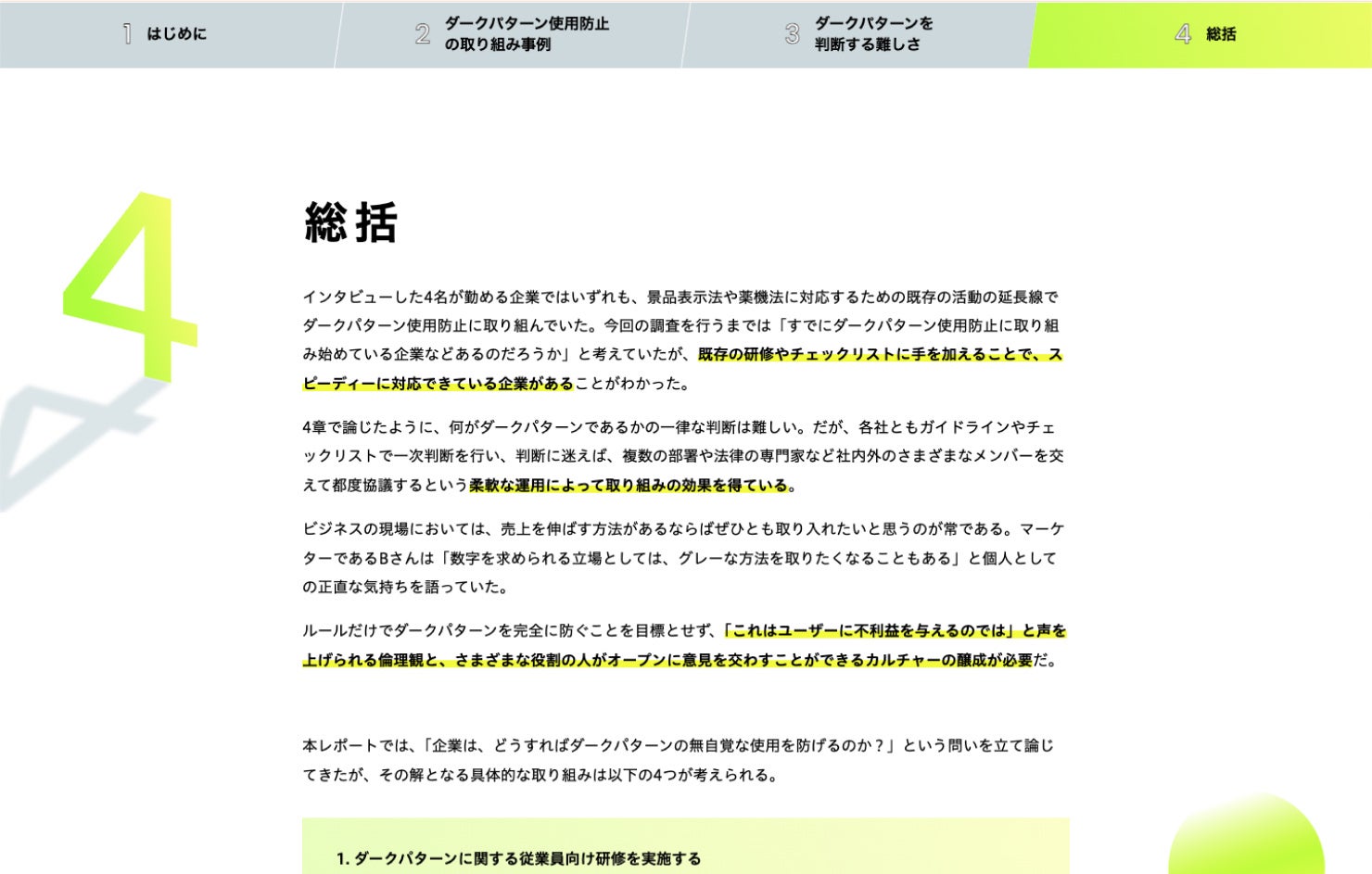 「ダークパターンの無自覚な使用」を防ぐための具体的な取り組みと、そうした企業の取り組みを推進していくために必要な業界・行政・社会の在り方を考え、調査内容を総括する。