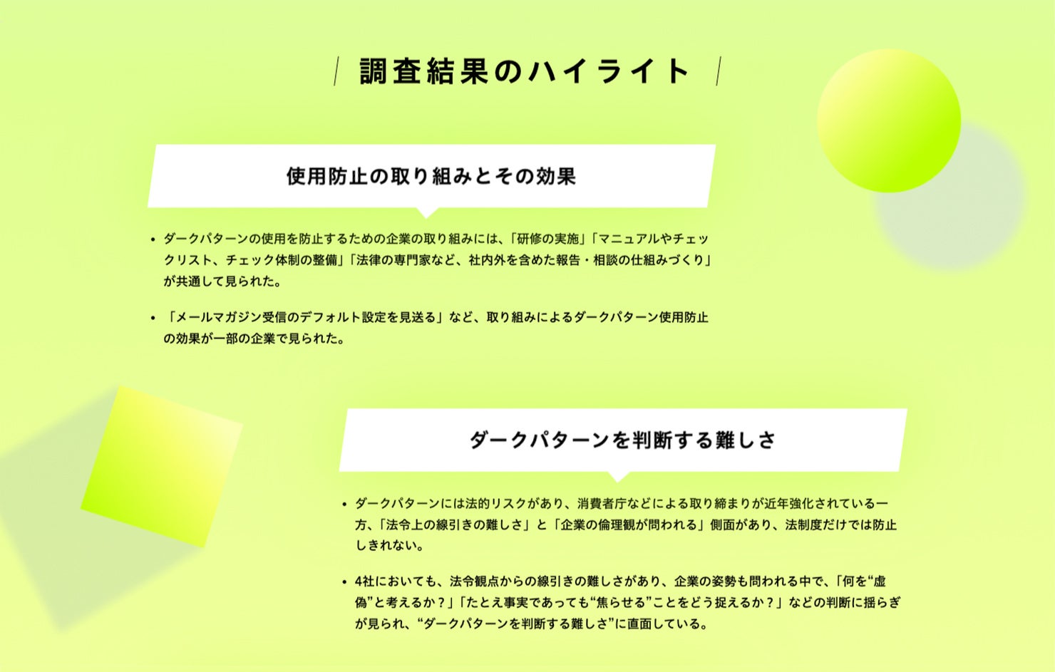 今回のレポートが、企業にとっても法的リスクやブランド毀損、顧客・従業員離れにつながる恐れのあるダークパターンの無自覚な使用を防止し、消費者とのより倫理的な関係を維持できる社会づくりに寄与することを願っています。