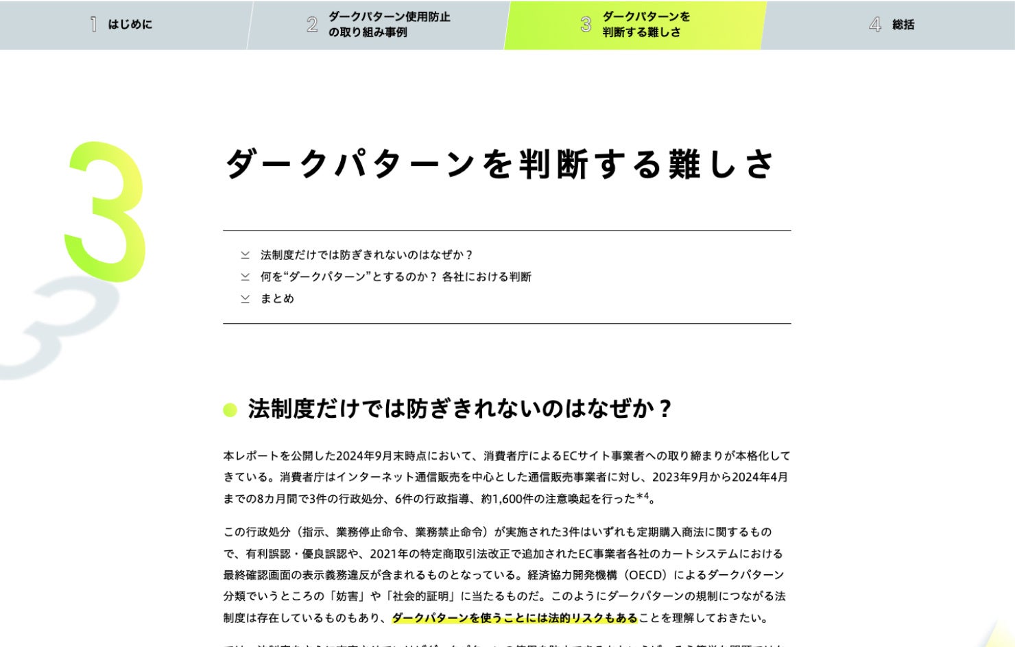 「ダークパターンレポート2024」ではその取り組みの具体内容や効果を紹介するとともに、法的リスクがありながらも法制度だけでは防ぎきれない「法令上の線引きの難しさ」と「法令外における企業の倫理観」という、ダークパターンの問題に向き合う上での課題について考察しながら、無自覚な使用を防ぐための論点を整理しています。
