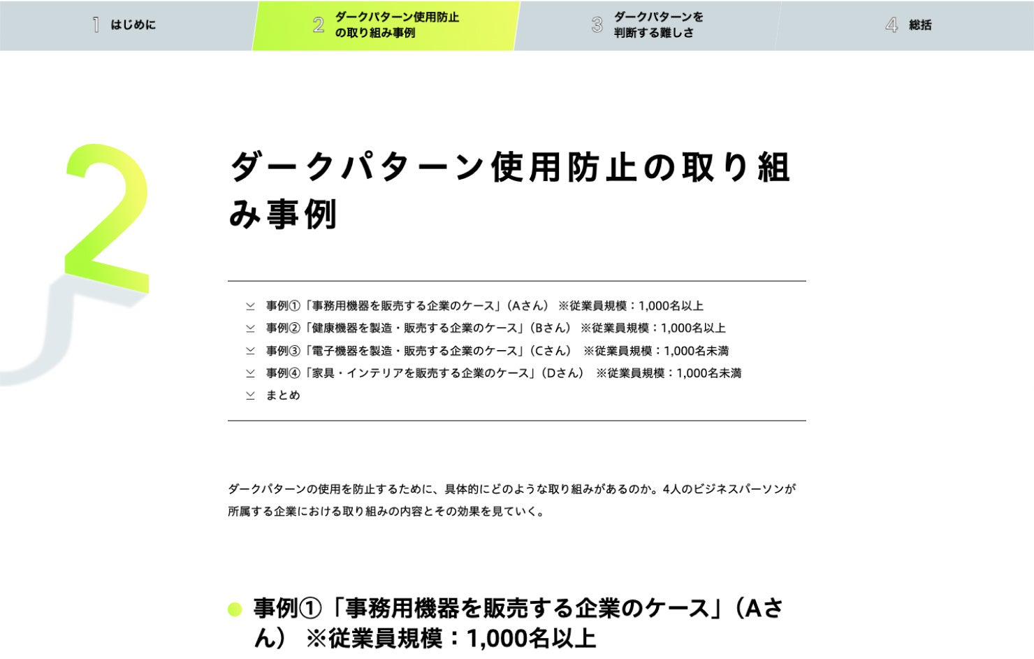 インタビューした4名が勤める企業ではいずれも、景品表示法や薬機法に対応するための既存の活動の延長線でダークパターン使用防止に取り組んでいました。今回の調査を行うまでは「すでにダークパターン使用防止に取り組み始めている企業などあるのだろうか」と考えていましたが、既存の研修やチェックリストに手を加えることで、スピーディーに対応できている企業があることがわかりました。