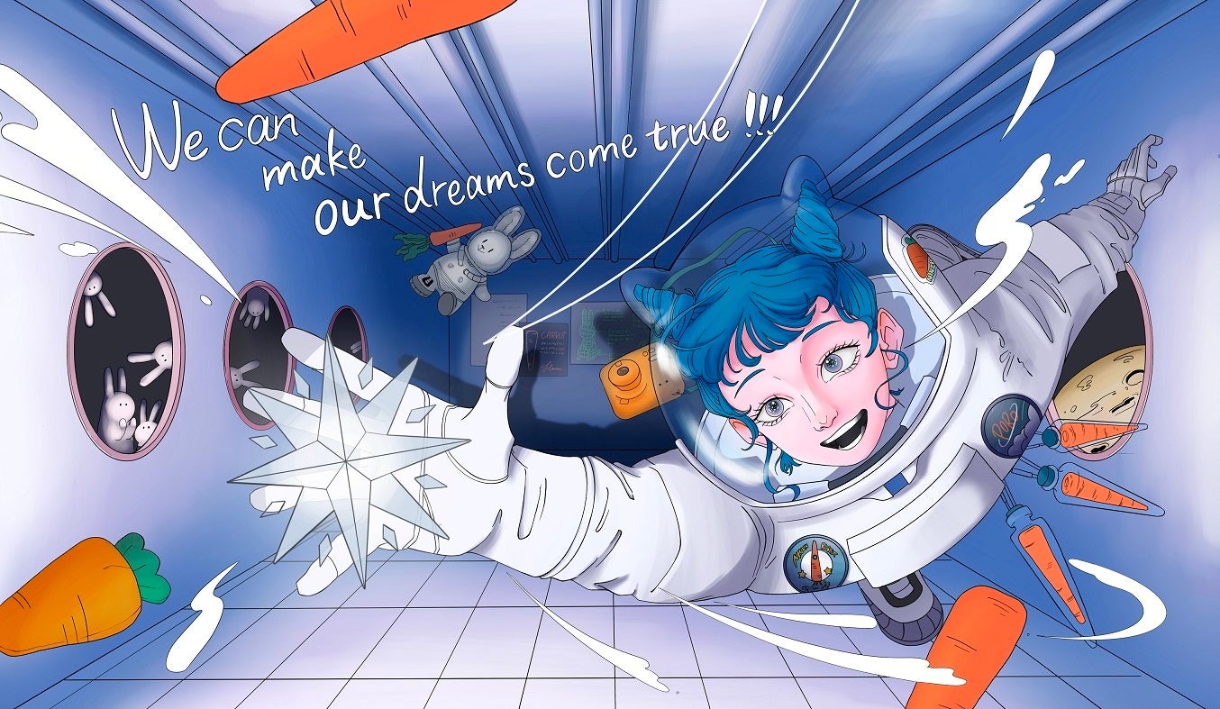 子供の頃に月にうさぎがいると信じた女の子が「月のうさぎ」に会う夢を叶えるストリーを描きました。主人公の女の子はきっといろんな人に否定されてきたと思いますが信じて諦めずに夢を叶えました。自分を含めた夢を追う人を肯定したいと思いこちらを制作しました。また、作品を掲示する枠を窓に見立て奥に別の世界が広がって見えるようなイメージで描きました。