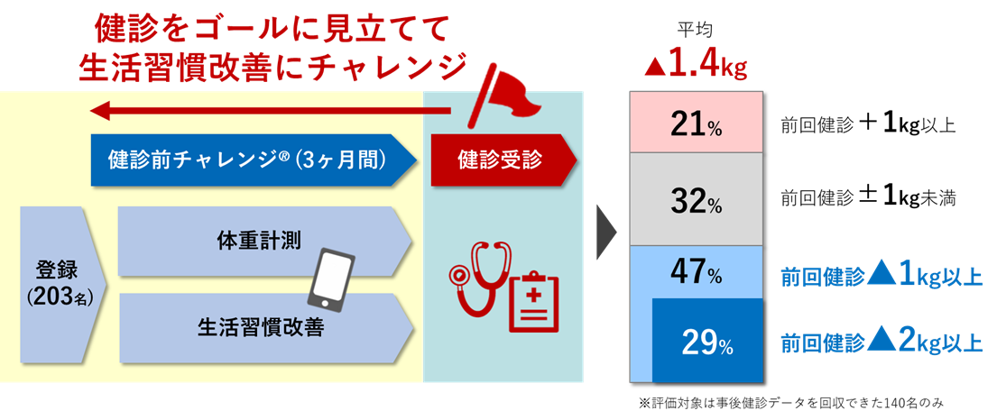 健診を良い状態で迎えるための事前対策「健診前チャレンジ®」によって前回健診時体重と比べて5割が1kg減、3割が2kg減を達成