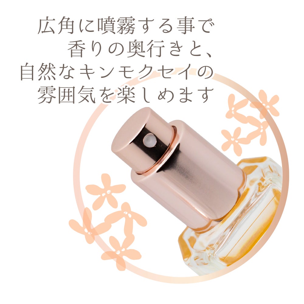広角に噴霧する事でより香りの奥行きを感じられ、まるで金木犀の並木道を散歩しているかのような、とても自然でエーテリアルな香りを存分に楽しめます。