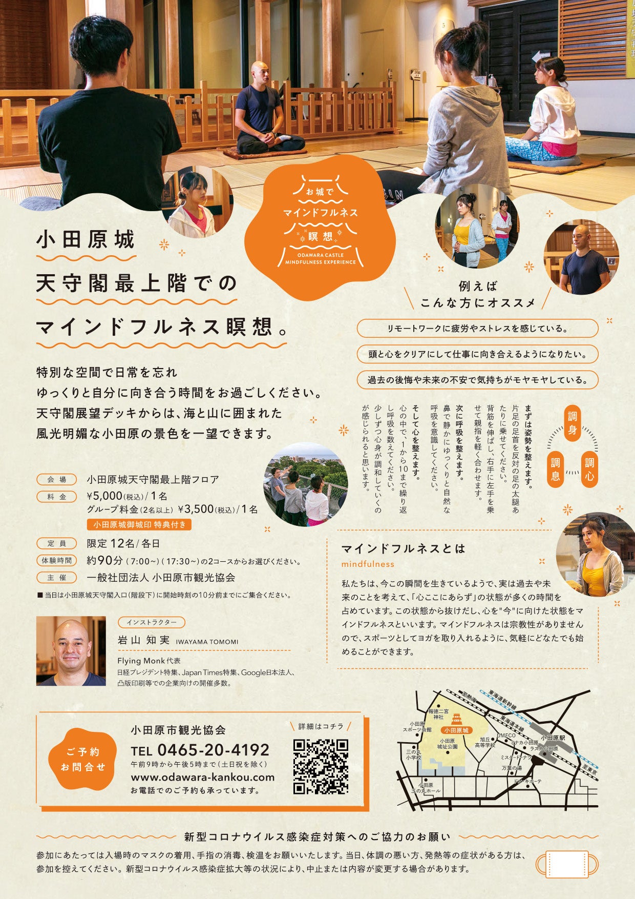 一般社団法人小田原市観光協会(神奈川県小田原市)は、小田原城天守閣を貸切にした特別体験プログラム 『お城でマインドフルネス瞑想~小田原城の特別体験~』 を実施しています。コロナ禍における「心の健康」をテーマに、昨年10月から試験的に始めた本プログラムが好評だったことから、通年での開催となりました。本プログラムを通じて、小田原城を活用した新たな観光コンテンツを提供するとともに、小田原観光のさらなる魅力を発信していきます。