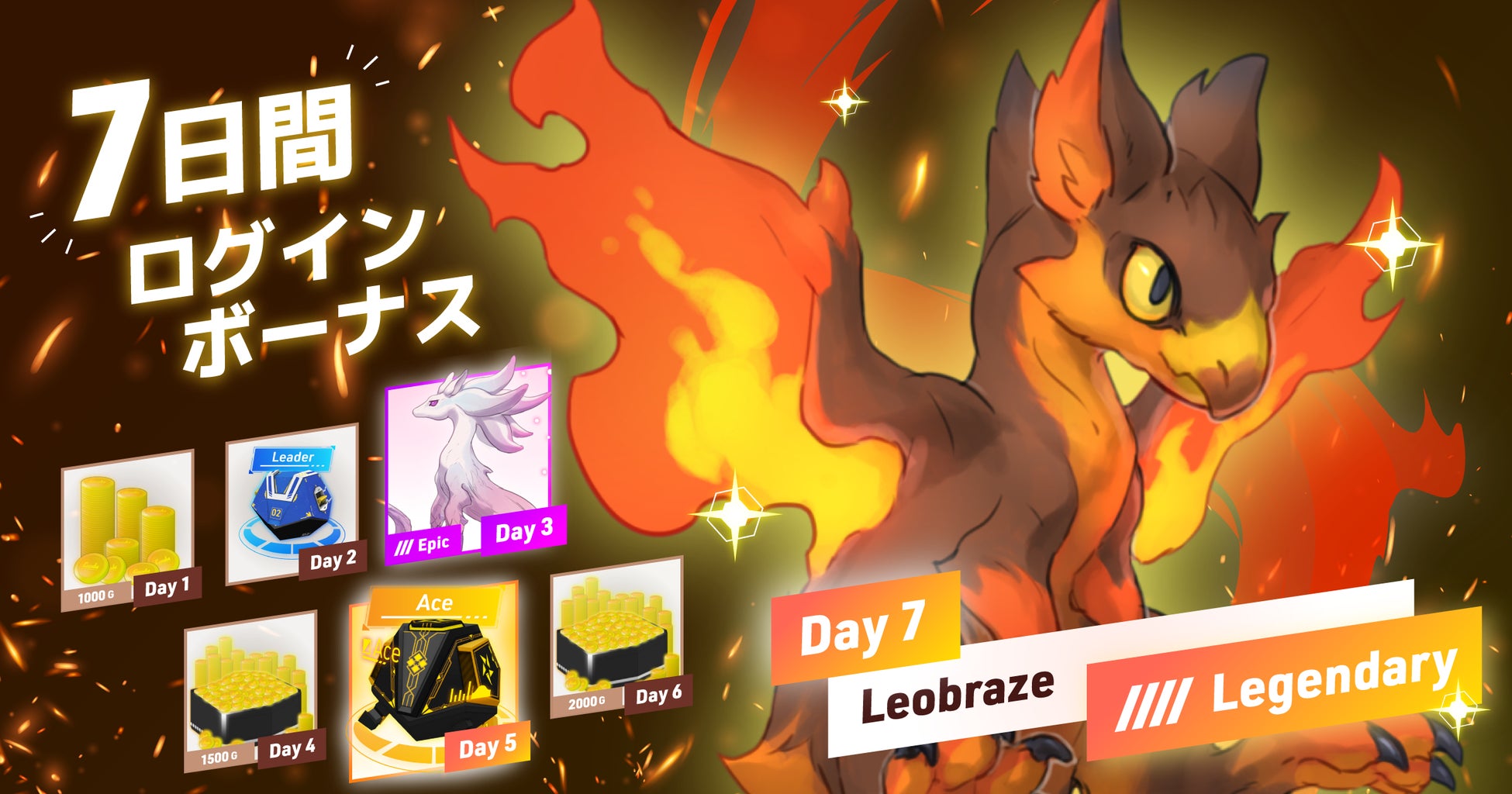 日本版リリース記念として、7日間連続ログインするとレジェンダリー(最高レア度)のバディである「リオブレイズ」を獲得できる【7Dayログインボーナスキャンペーン】を実施いたします。本キャペーンではログイン日数に応じて宝箱やゴールドを獲得でき、7日目のログイン日にレジェンダリーの獲得が可能です。