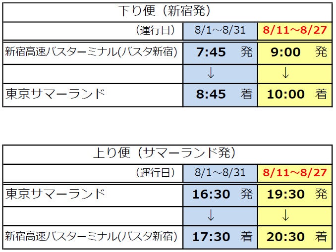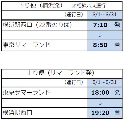 「新宿~サマーランド線」は、バスタ新宿発着で東京サマーランドとの間に1日1往復、8月11日~27日の間は1日2往復運行します。また「横浜~サマーランド線」は相鉄バス株式会社(本社:神奈川県横浜市、取締役社長:大久保 忠昌)と共同で1日1往復運行します。