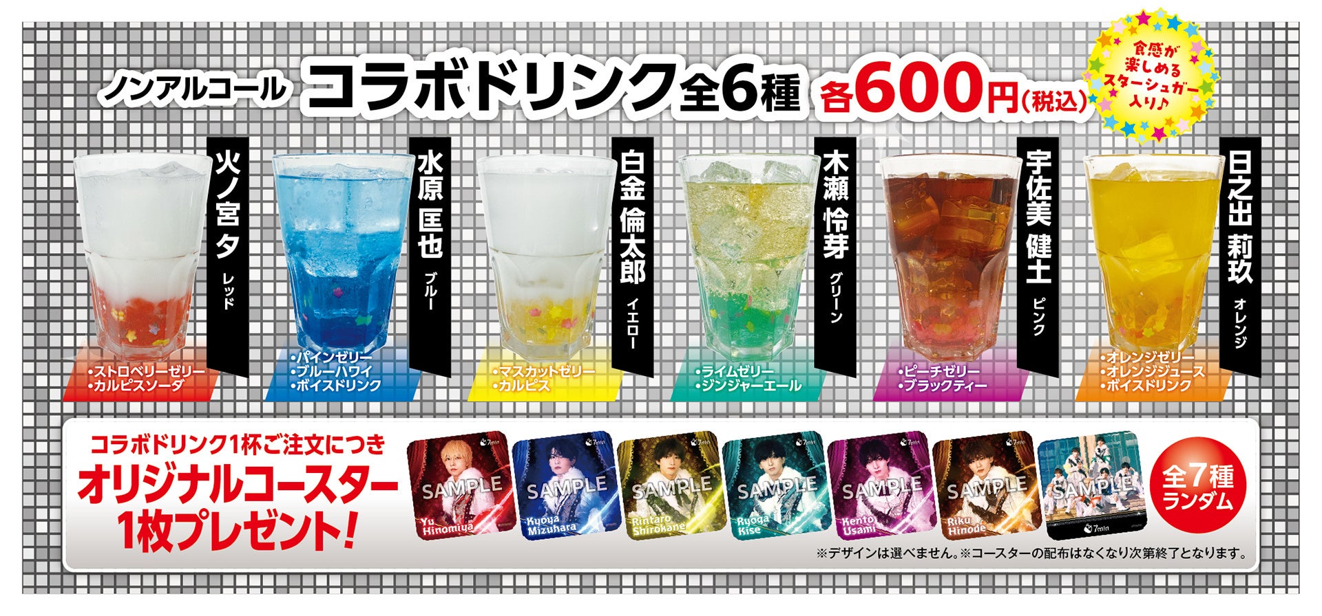 キャンペーン期間中、メンバ―カラーをあしらったコラボレーションドリンクを5店舗限定で販売します。コラボレーションドリンクをご注文いただいた方にはオリジナルコースター(全7種)をランダムでプレゼント!
