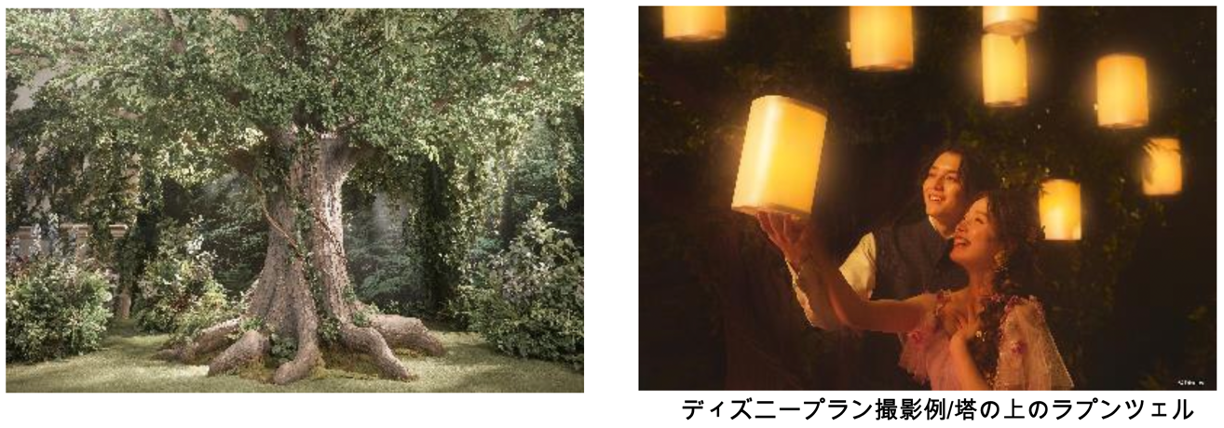 ディズニープランでは、「ディズニー ウエディングドレスコレクション」を体現するため、着用される衣裳に合わせたスタジオセット、ヘアメイク、撮影小物などすべてがプランに含まれています。さらに、世界観に合わせたポージングや表情もスタジオ専属フォトグラファーがアドバイスいたします。映画さながらの本格的なセットを舞台に、さまざまなメモリアルフォトをご提案いたします。