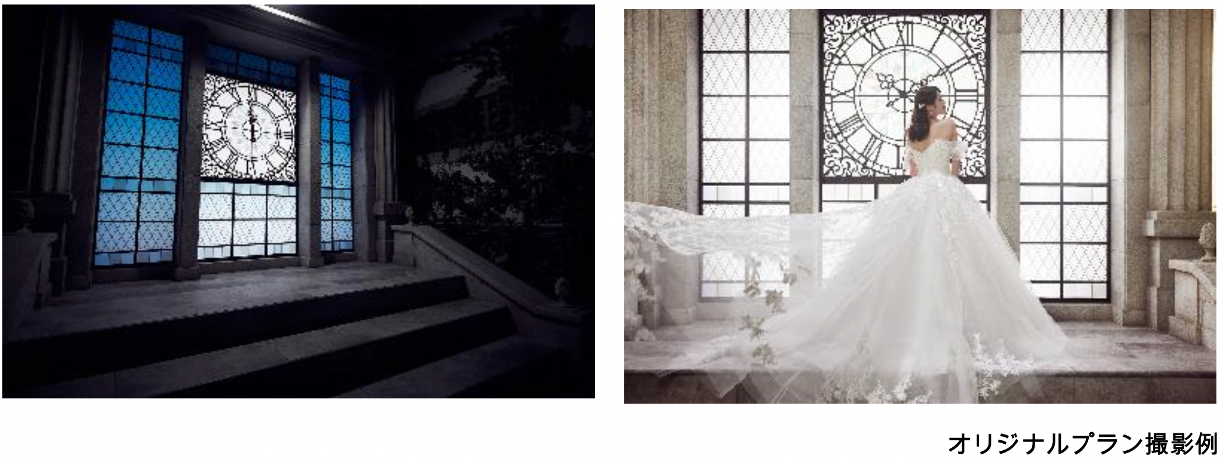 白いヨーロッパのお城をイメージしたスタジオセットでは、映画の美術セットのような大時計と階段を舞台に、他では叶えられないストーリー性の高いメモリアルフォトを撮影できます。時計の針はおふたりの思い出の時間に合わせていただくことができます。