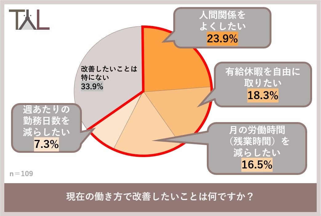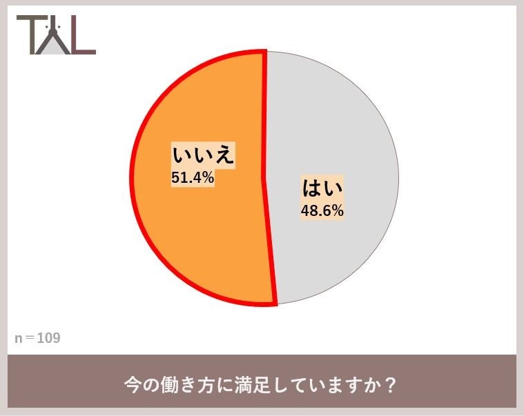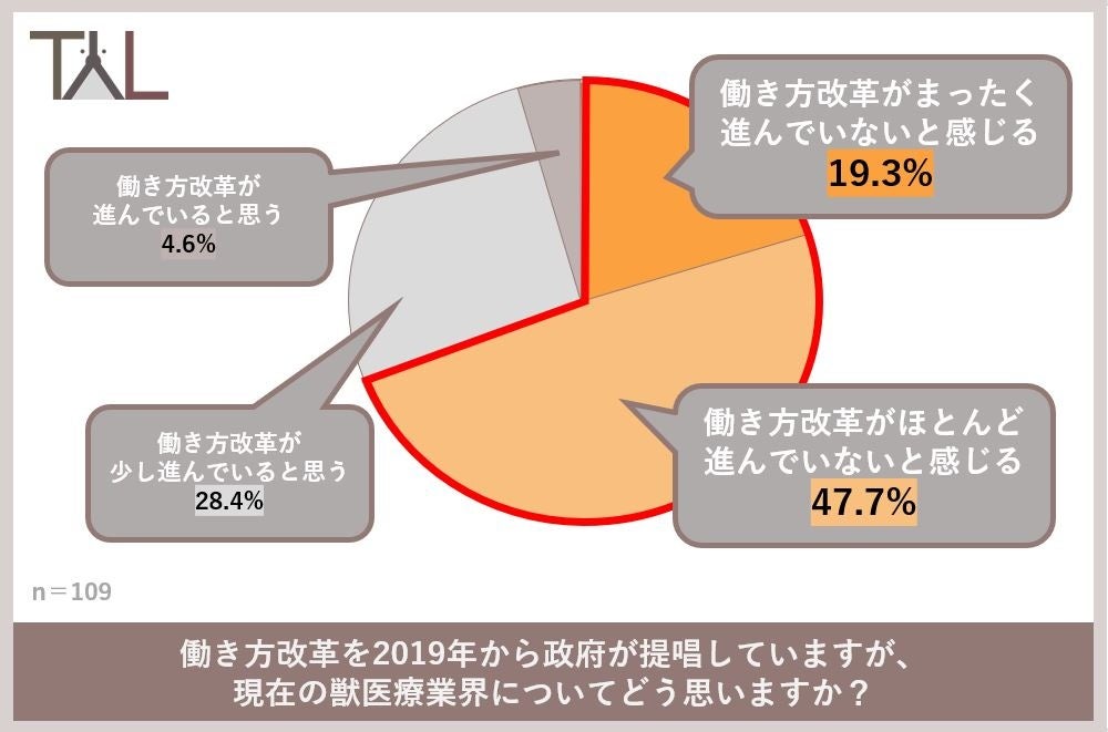 ペットの家族化推進をミッションとし、ペット医療DXをおこなう株式会社TYL(本社:東京都港区 代表取締役:金児 将平、以下TYL)は、獣医師109名に対し、「働き方に関する意識調査」をおこないました。その結果、獣医師の2人に1人が、今の働き方に満足していないことが判明し、約7割の獣医師が「働き方改革がまったく進んでいない」「働き方改革がほとんど進んでいない」と回答しました。このことから、獣医療業界はまだまだ労働環境が整っておらず、改善していく必要があることが分かりました。