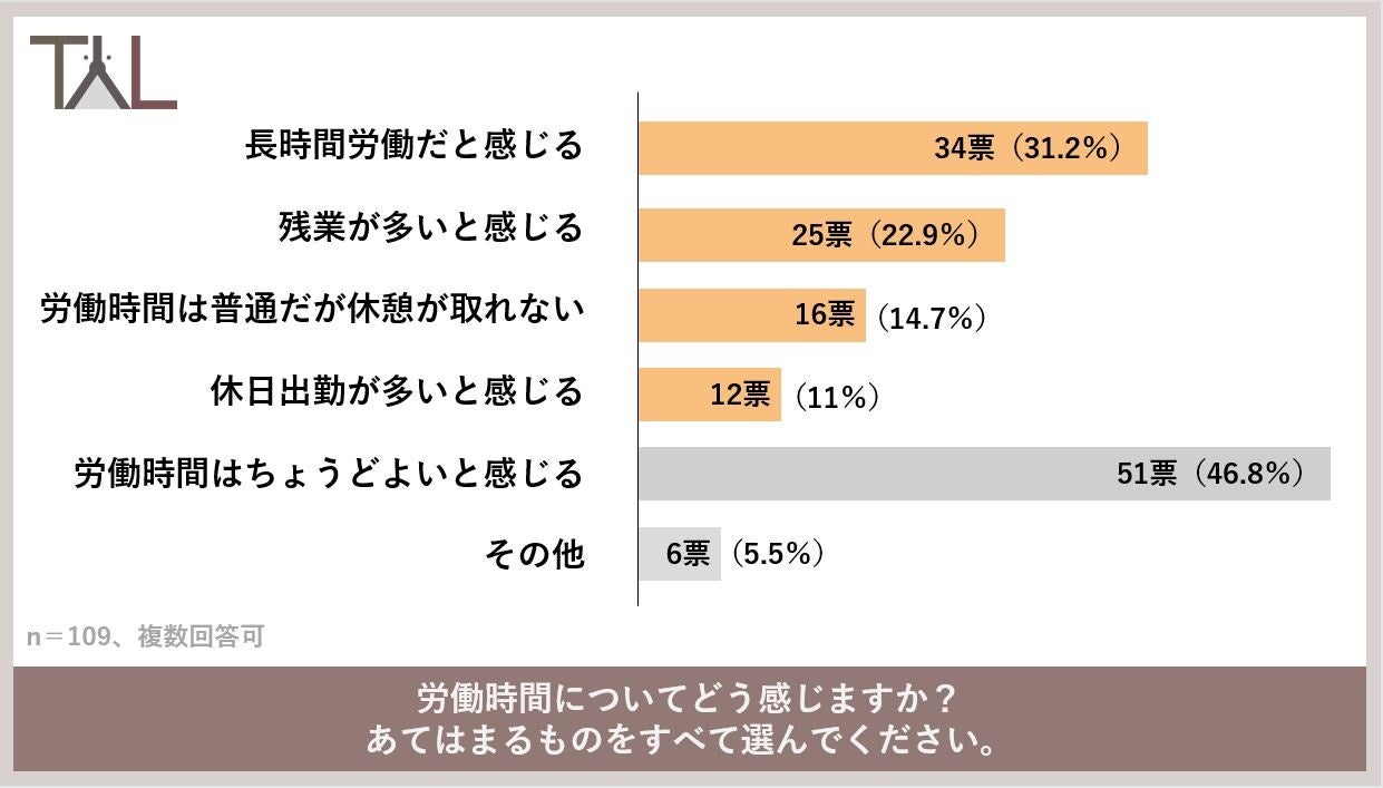 獣医師109名に対し「今の働き方に満足していますか?」と質問したところ、51.4%が「いいえ」と回答しており、獣医師の2人に1人が今の働き方に満足していない状況ということが分かりました。また、「労働時間についてどう感じますか?」(複数回答可)の質問に対し、もっとも回答が多かったのは「長時間労働だと感じる」で、「労働時間がちょうどよい」と回答したのは109名中51名という結果になりました。この結果によると、約半数の獣医師が労働時間に何かしら不満を抱えているといえます。