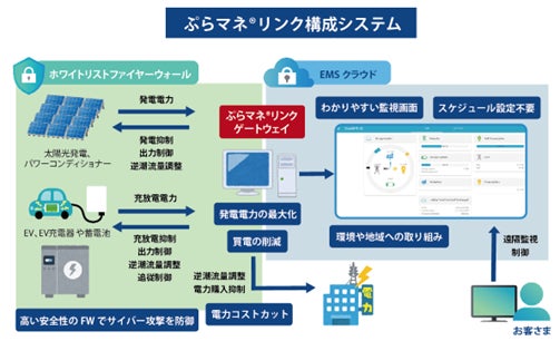 2023年10月より、山梨県の米倉山次世代エネルギーシステム研究開発ビレッジ(Nesrad)にて、実証実験を開始した「ぷらマネ®リンク」は、多様な周辺機器を一元制御できる手軽さが評価され、現在では脱炭素化に取り組む企業・自治体の工場や社屋でのオンサイトPPA太陽光発電システムなどに導入されています。今回のEV充電ソリューションにおいても、このEMS技術を活用し、エネルギーマネジメ