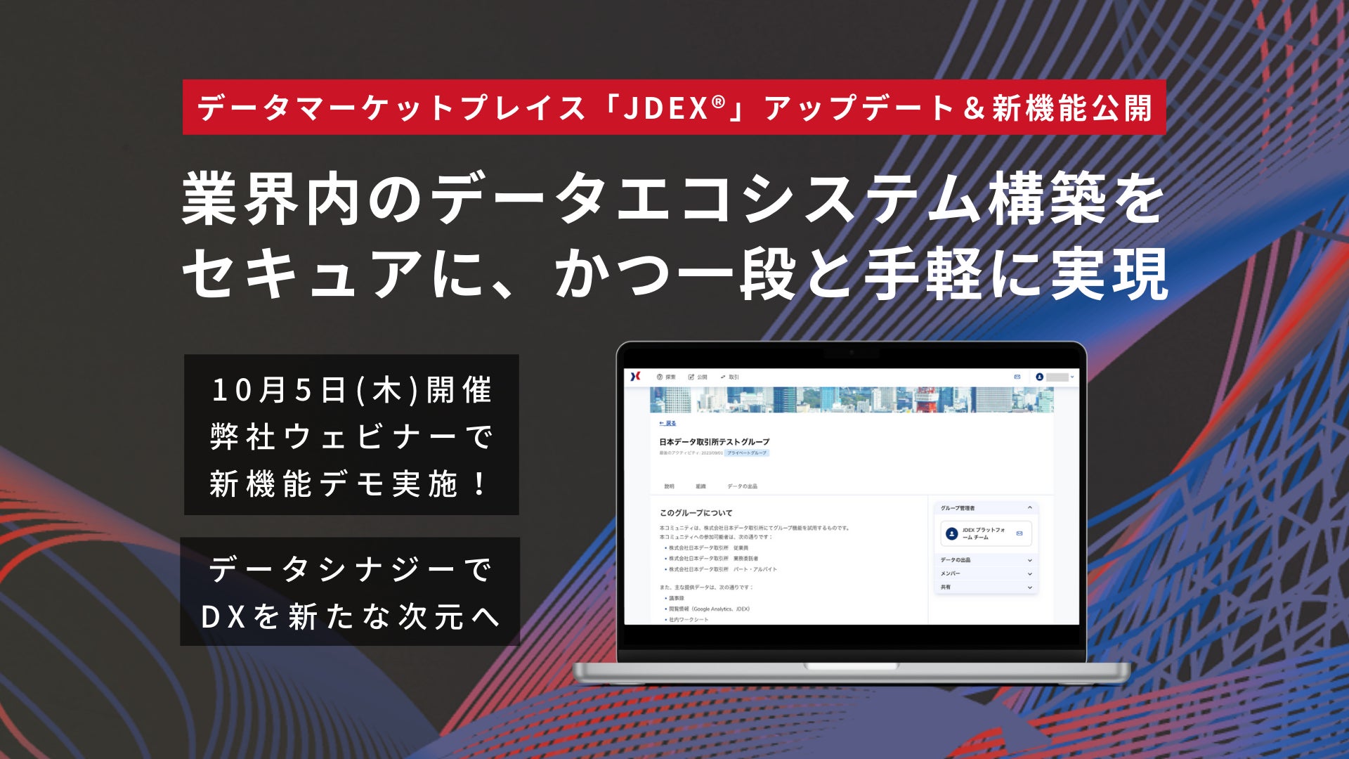 株式会社日本データ取引所(本社:東京都渋谷区、代表取締役:森田直一、以下「当社」)は、データマーケットプレイス「JDEX®️」の新機能を公開いたしました。今回のアップデートで導入された招待制によるクローズド環境である「グループ機能(仮)」は、複数組織間でのセキュアかつ効率的なデータ取引を実現し、業界・サプライチェーン内のデータシナジーをいっそう強化し、DXの実現を加速させるものです。