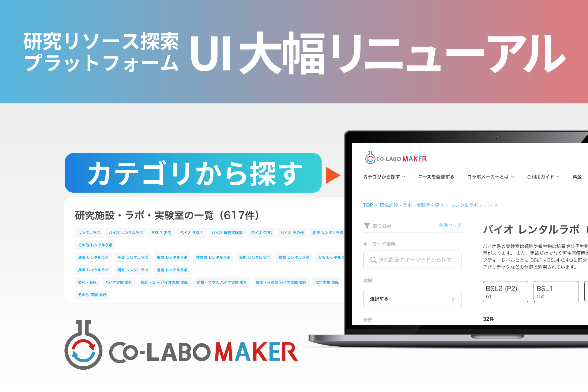 ラボシェアで研究開発を加速するCo-LABO MAKER、研究リソース探索プラットフォームのUIを大幅リニューアル