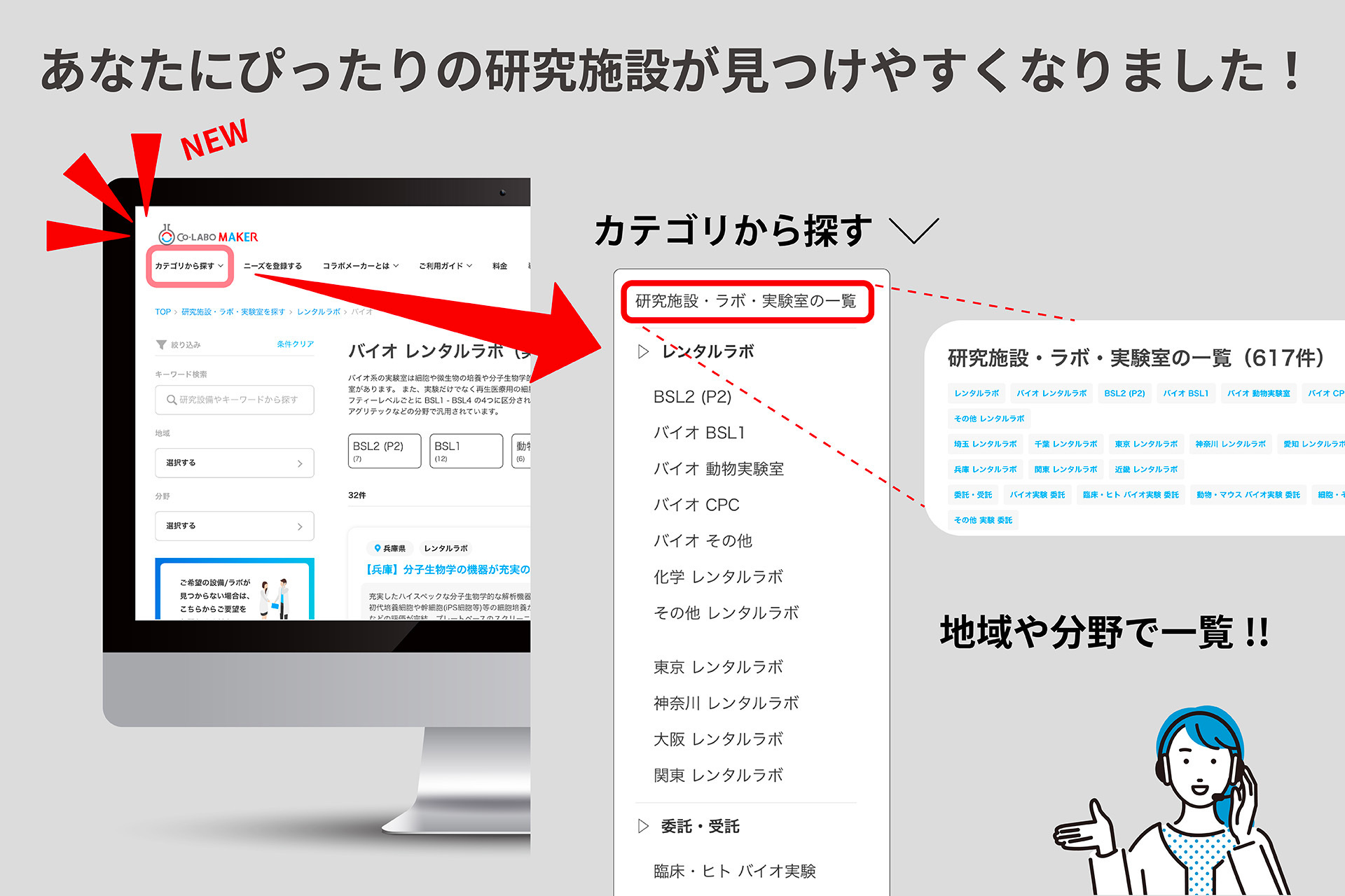 ①レンタルラボ及び委託試験が受け入れ可能な施設を、カテゴリごとに一覧で見ることが可能に