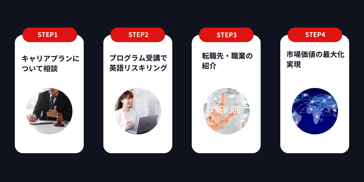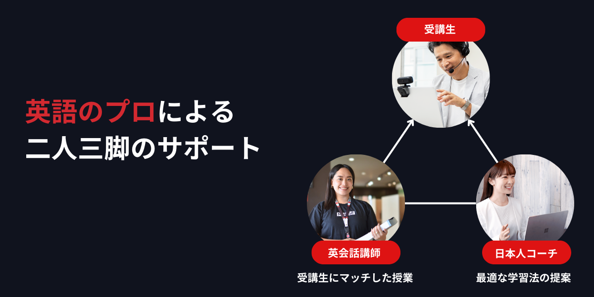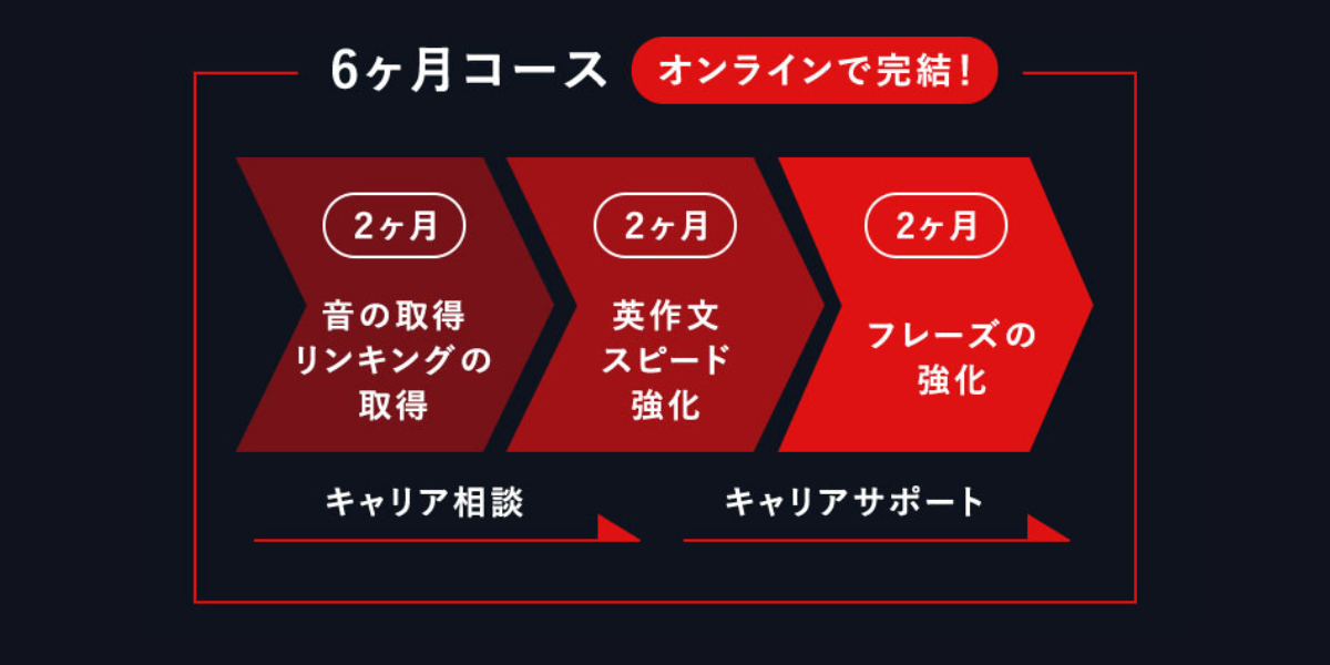 ビジネスパーソンの市場価値最大化を目的として英語の最短習得をサポートする独自開発のプログラムです。特徴は大きく3つです。1つ目は10,000名の英語学習者のデータと第二言語習得論をベースとした「音から始める最短メソッド」。2つ目は、このメソッドの実行を徹底的にサポートする日本人のプロ英語コーチと英会講師の二人三脚体制。そして、最後は英語でキャリアを拓くために必要なキャリアサポートをプロのキャリアカウンセラーが行います。この徹底的なサポート体制で、英語初級者でも6ヶ月で英語でキャリアを拓くを実現します。