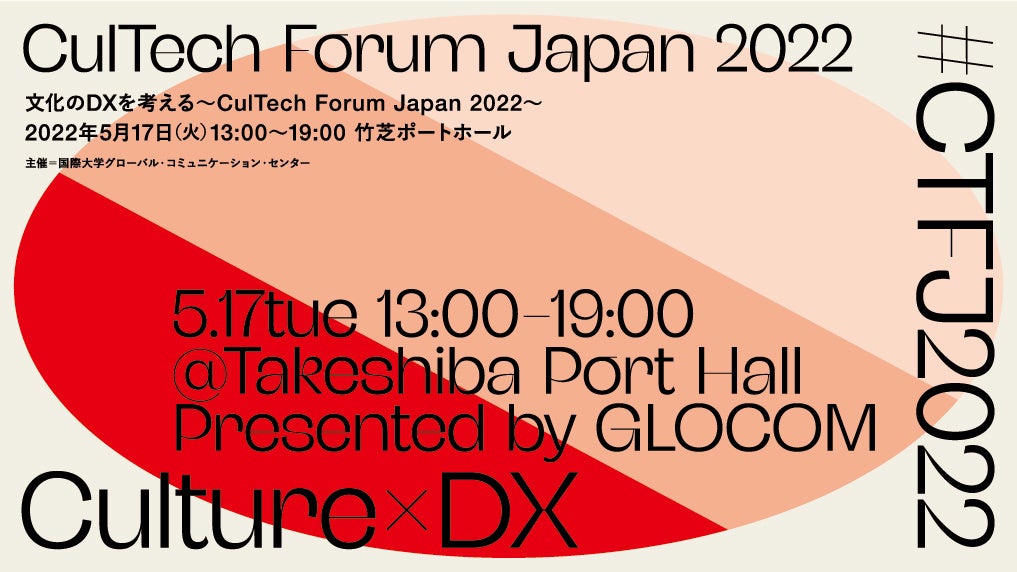 | ■イベント名:文化のDXを考える~CulTech Forum Japan 2022~ ■日 時 :5月17日(火) 13:00-19:00(12:30開場) ■開催形式:ハイブリッド形式(会場参加:最大同時入場者数 100名およびオンライン配信) ■会 場 :竹芝ポートホール(〒105-7501 東京都港区海岸1-7-1東京ポートシティ竹芝 オフィスタワー1階) ■申込方法:以下Peatixでの事前チケット申込制(会場参加・オンラインともに) https://ctfj2022.peatix.com ■主 催 :国際大学グローバル・コミュニケーション・センター ■協 力 :東京ポートシティ竹芝ポートホール |