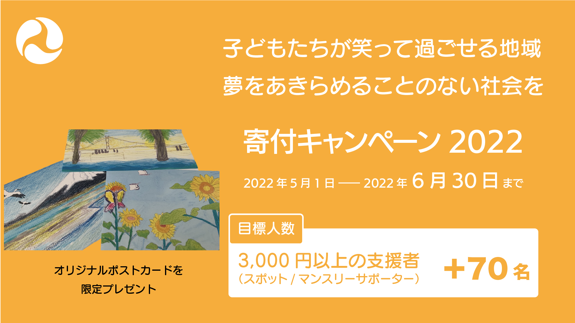 特例認定NPO法人兵庫子ども支援団体(所在地:兵庫県明石市、代表理事:多田実乘、以下「当法人」という)は、認定NPO法人申請に向けた取り組みの1つとして新規寄付サポーターを70名募集する寄付キャンペーンを2022年5月1日(日)から2022年6月30日(木)まで実施いたします。また、今回ご支援頂いた方限定で当法人の活動に参加する子どもたちが描いた絵をポストカードにしてお渡しいたします。