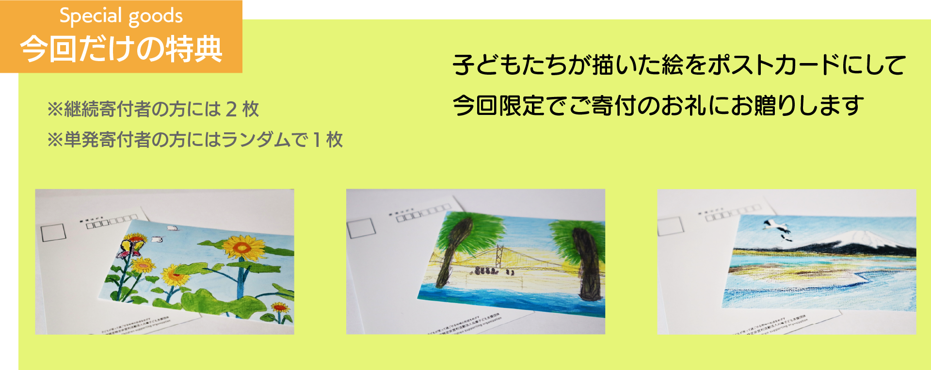 兵庫子ども支援団体は、認定NPO法人の申請を目指して5月1日から6月30日まで寄付キャンペーンを実施いたします。本期間にご支援頂いた方限定で、子どもたちが描いた絵をもとにしたオリジナルポストカードをお渡しいたします。