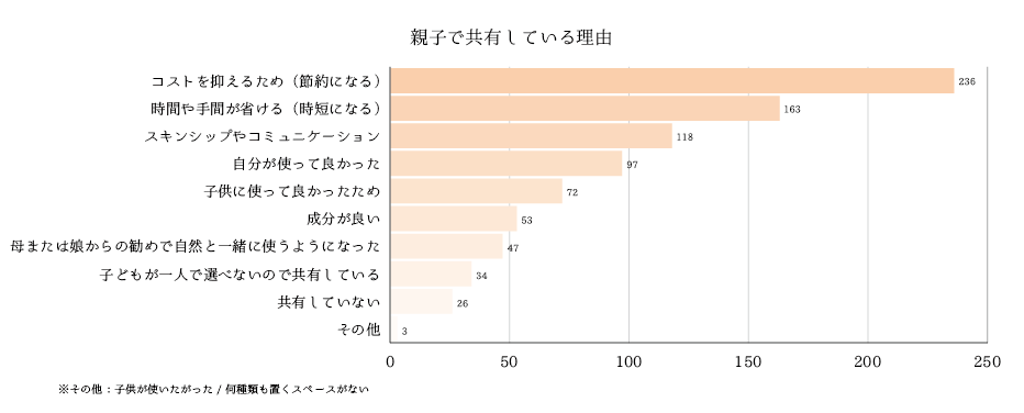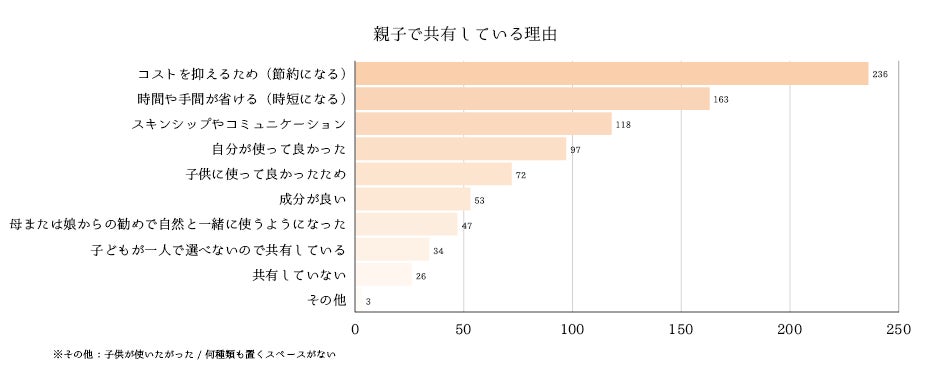 母親がケア商品を共有している理由トップ3は「節約」、「時短」、「一緒に使えるのが楽しい(スキンシップのため)」