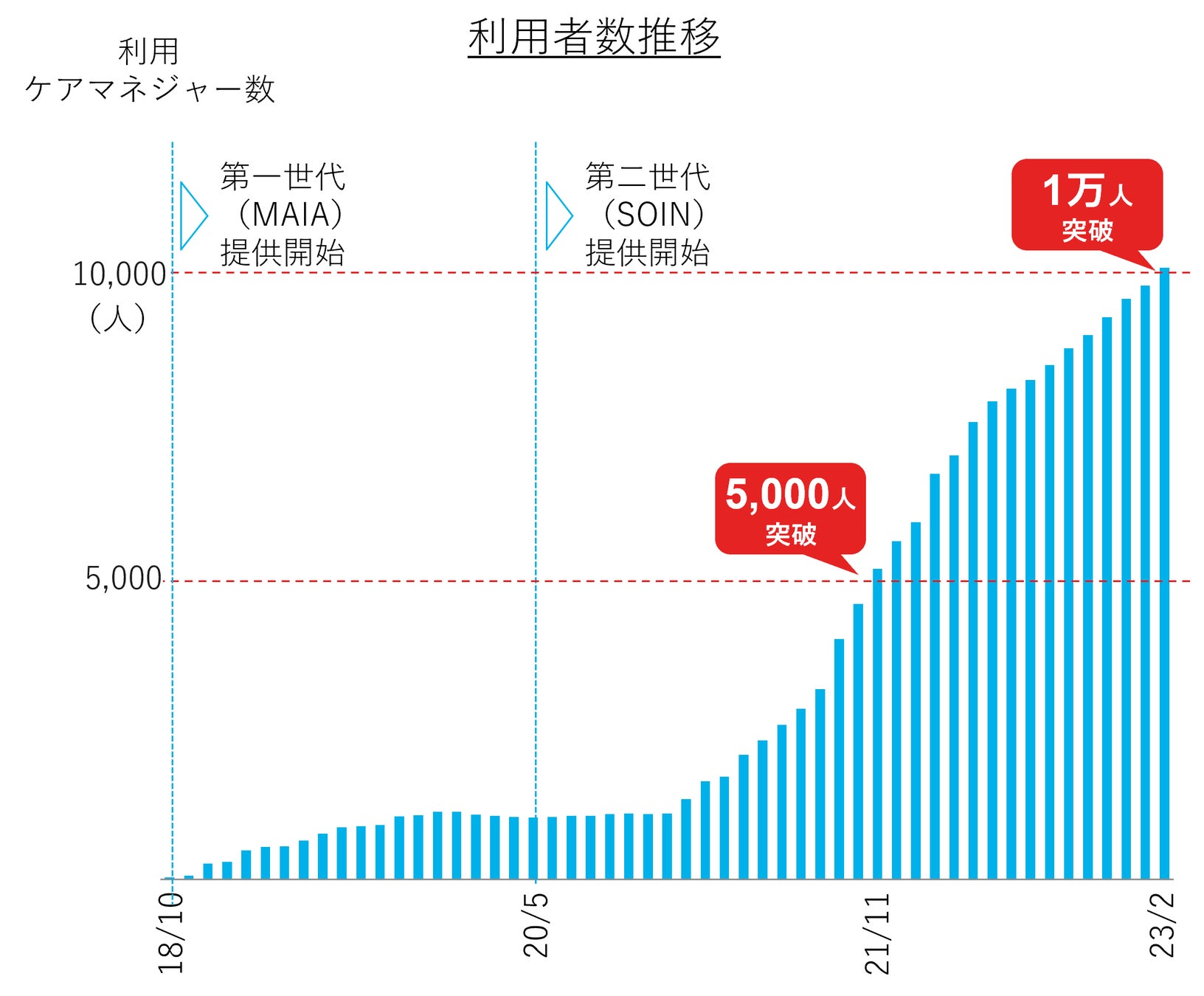 その後も商用環境において実証と改良を重ねながら、多くのケアマネジャーにその有効性をご理解いただきつつ成長を続け、2023年2月に有償利用者数が1万人を突破致しました。