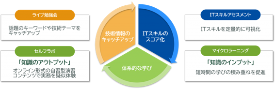 ITアセスメントツール「LB-GAIT」によりITスキルをスコア化し、学習の目的や課題にあわせて用意された複数のキャリアパスの中から選択できる知識習得型コンテンツや、様々なテーマに沿ったライブ勉強会で効率的なスキル習得を可能にします。また、疑似的な業務を体験できる演習型コンテンツでは、就業先での業務に直結したシナリオに沿って学習することができます。