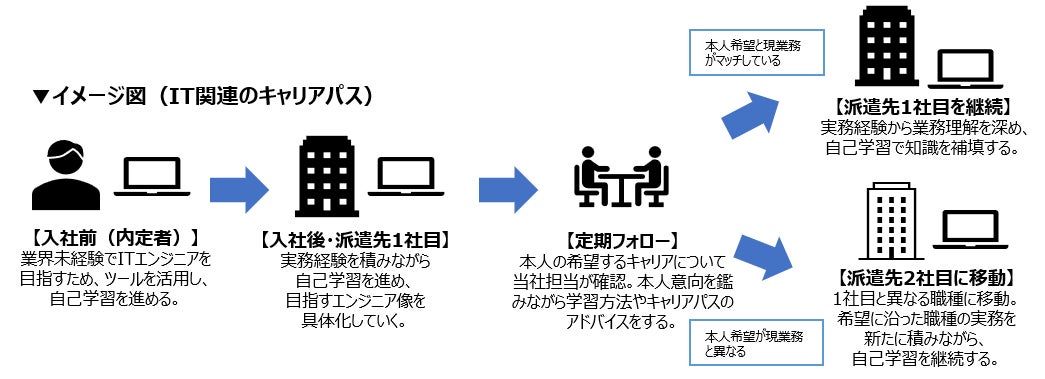 今後、入社前から継続して学びたいというエンジニアの希望に応えるとともに、入社後の中長期的なスキルアップを支援し、個々のスキルにあった派遣先とのマッチングをおこなうことで、IT業界の人手不足を解消してまいります。