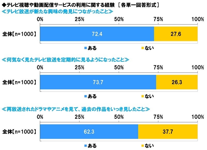 ≪テレビ放送が新たな興味の発見につながったこと≫では「ある」が72.4%、「ない」が27.6%、≪何気なく見たテレビ放送を定期的に見るようになったこと≫では「ある」が73.7%、「ない」が26.3%、≪再放送されたドラマやアニメを見て、過去の作品をいっき見したこと≫では「ある」が62.3%、「ない」が37.7%となりました。