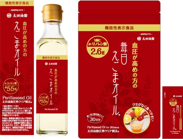 日本で初めて食用の「えごまオイル」を開発した太田油脂株式会社(本社:愛知県岡崎市 代表取締役社長:太田 健介)は、機能性表示食品「血圧が高めの方の えごまオイル180g」「血圧が高めの方の 毎日えごまオイル」を2024年2月27日に新発売いたします。