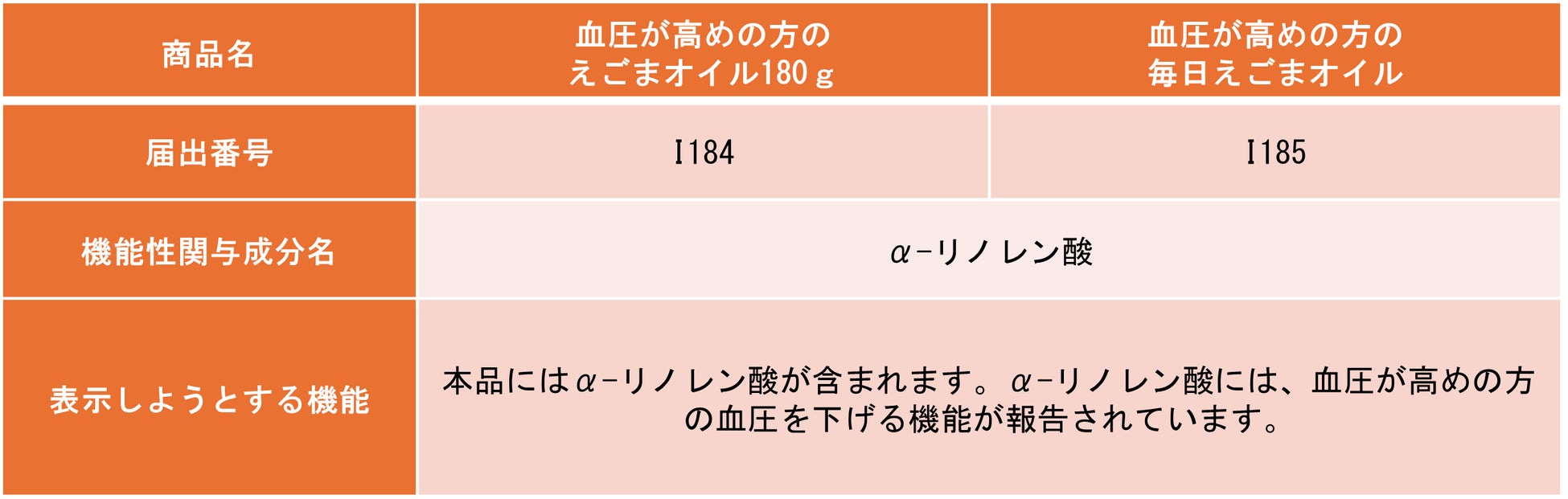 ※1 食用えごま油を100%使用し、α-リノレン酸による血圧に関する小袋入りの「機能性表示食品」としては、日本で初めて消費者庁に届出が受理されました。