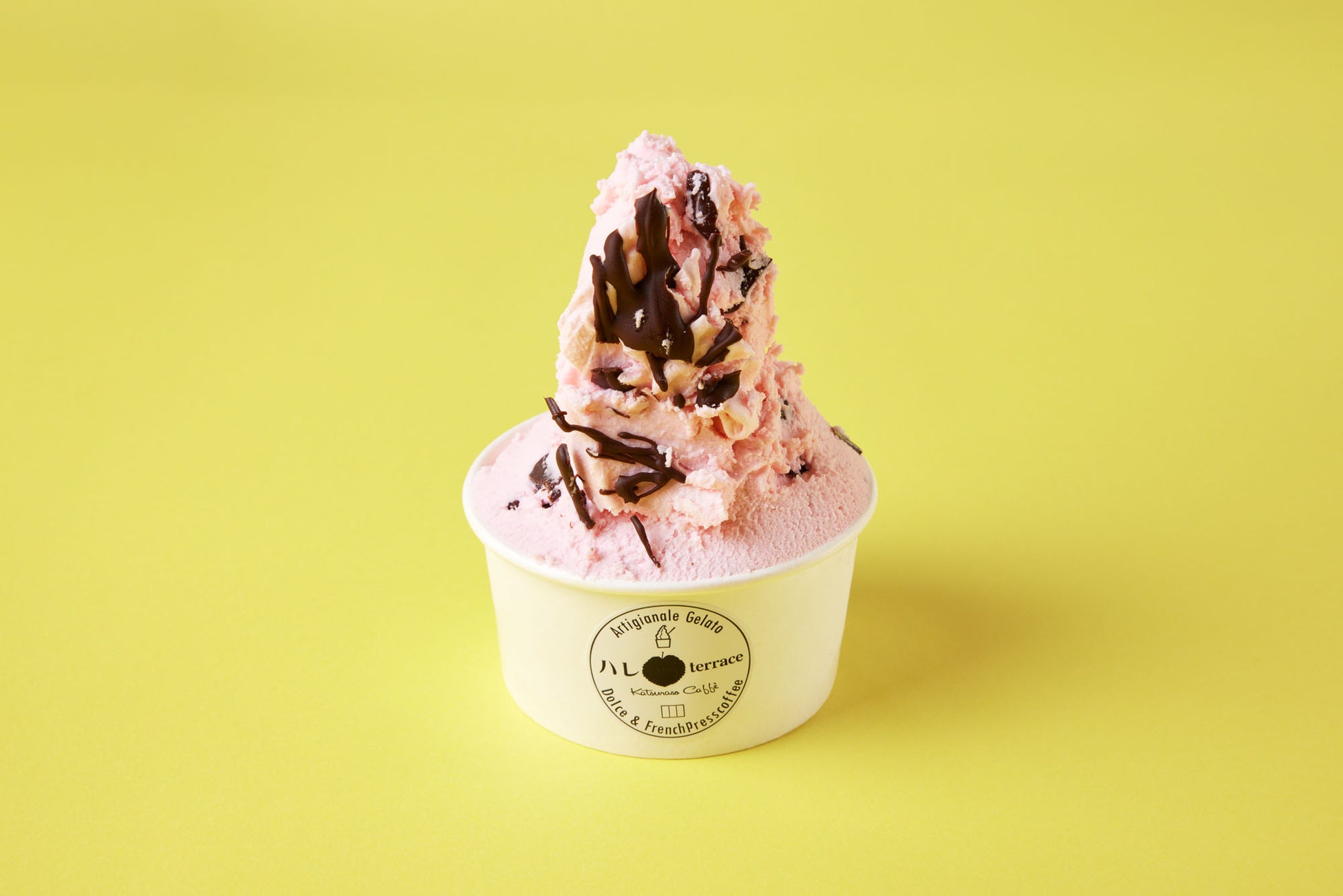 見ているだけでもワクワクするようなジェラート専門店。この季節限定でお目見えするのは、桃とさくらのジェラートにチョコがかかった一品。