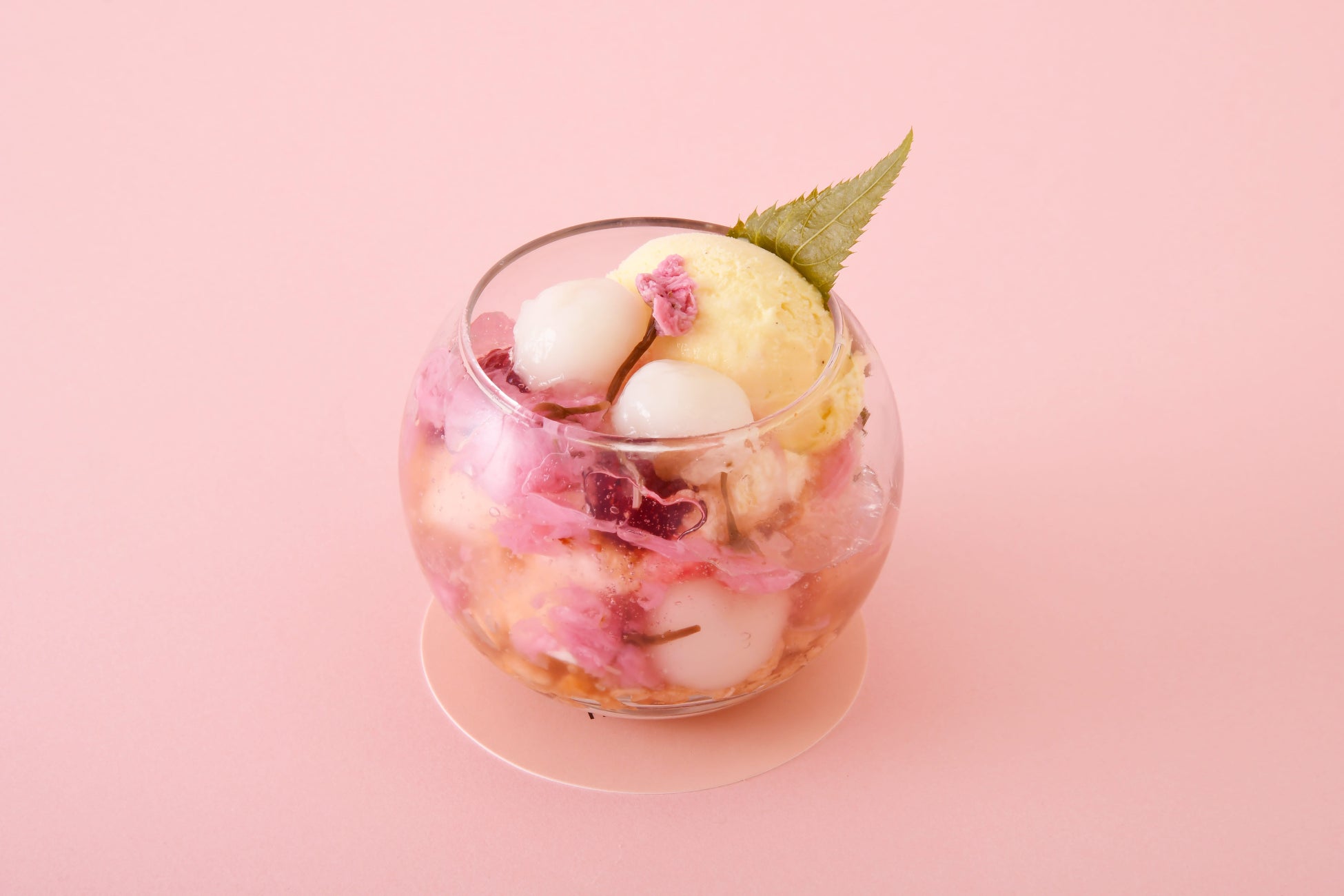 桜の香りが春らしい、花びら入りのゼリーが入ったパフェ。