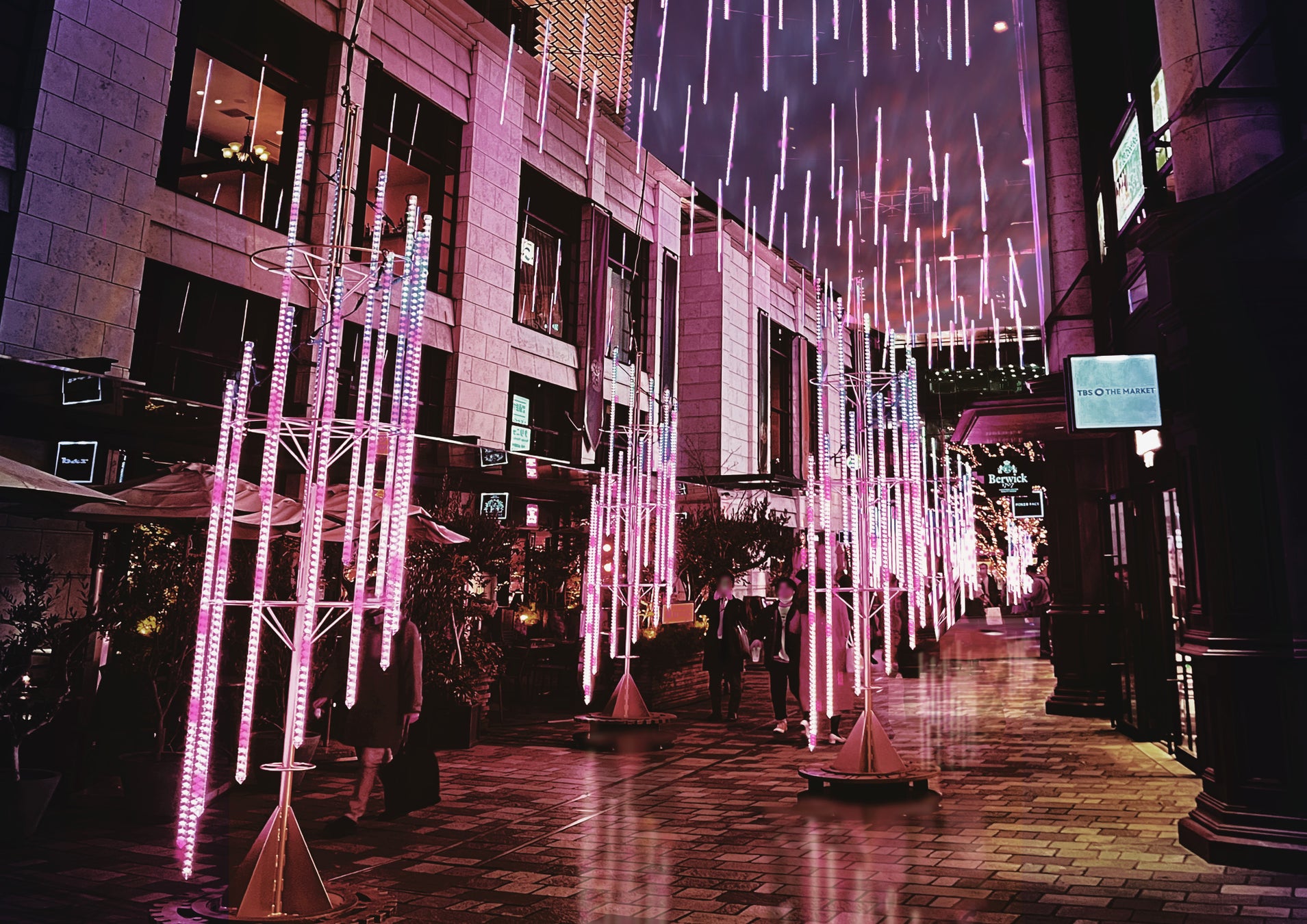 春の名曲に合わせて、ピンク色のイルミネーションが桜吹雪のように輝き、幻想的な空間を演出します。さくら坂の桜並木とともに、桜ピンクの赤坂で春の夜をお楽しみ下さい。