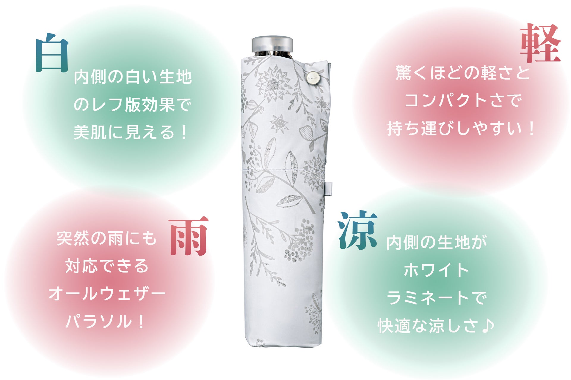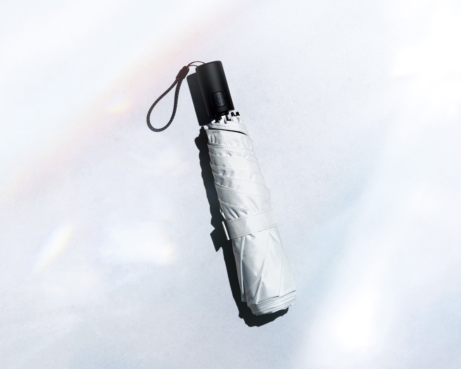 Fuwacoolは、帝人フロンティアとムーンバットが共同開発した特別な生地を使用し、驚くほどの軽さと涼しさを実現した晴雨兼用日傘。遮光率は最高水準で、内側には熱をカットするホワイトラミネート加工が施され、美白ケアにも最適なアイテムです。