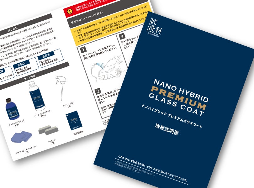 プロ向けのガラスコーティング剤も手掛ける匠洗科が、一般のお客様でも安心して施工を進めていただけるように作成したマニュアルも付いています。