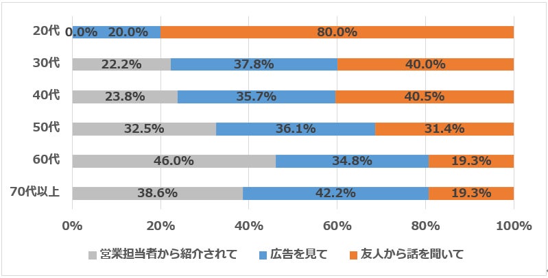 不動産投資を始める人が多い30代・40代の回答者は「友人から話を聞いて」の割合が他の世代より高い傾向が出ています。実際に不動産投資で成功を感じている身近な人から聞く話はとくに影響を受けやすいでしょう。