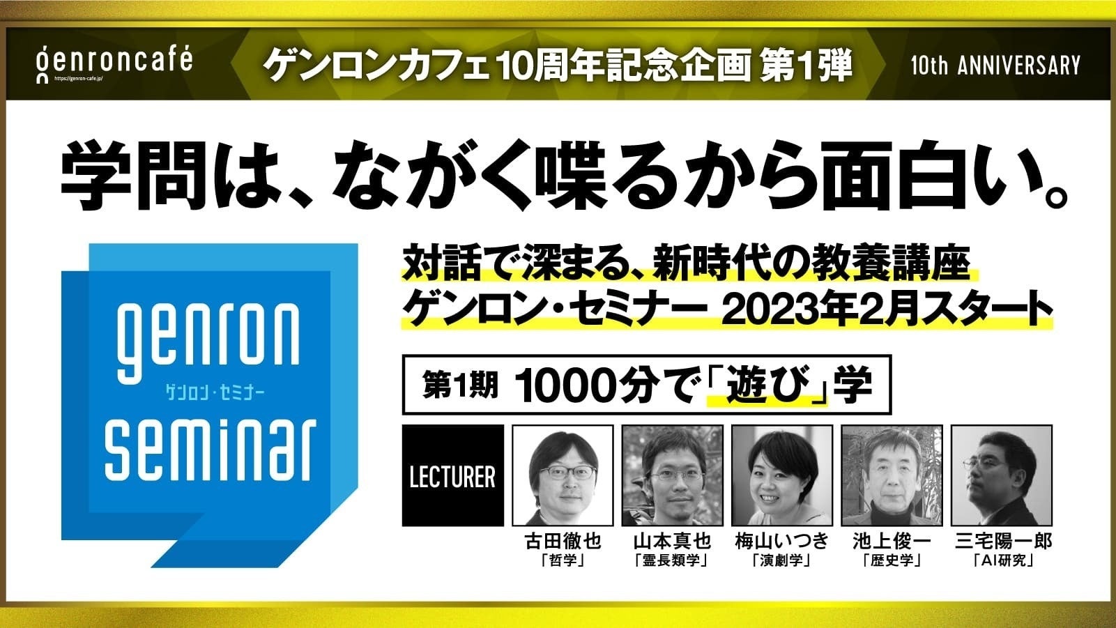 ゲンロン・セミナーは、さまざまな分野の専門家たちと「いま」を考える教養講座。第1期となる2023年上半期(2月〜7月)は、「1000分で『遊び』学」を共通テーマにして、月にいちど、土曜日の午後に講座を開講いたします。会場参加とインターネット配信を通じてお届けする、知的好奇心旺盛な観客のみなさまに開かれた講座です。