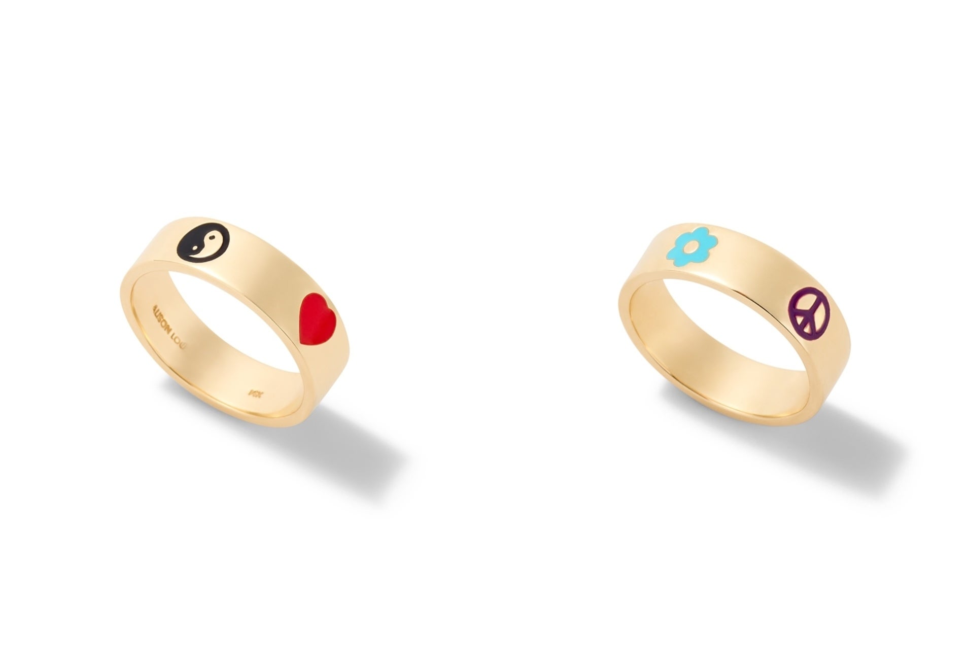 カラーエナメルで施された(右から)ピースサイン、フラワー、ハート、インヤン(陰陽)モチーフが取り囲むデザイン。