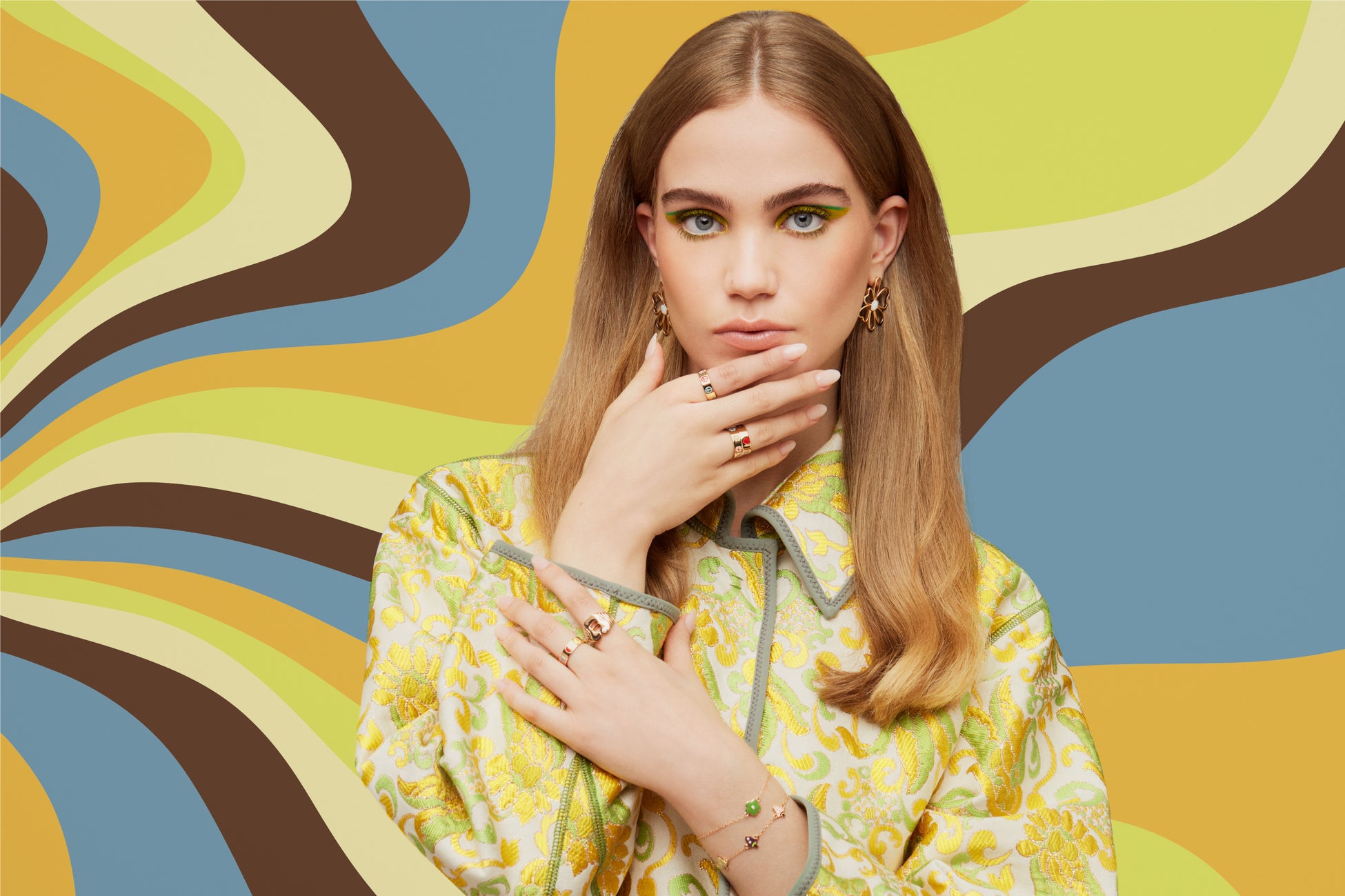 60~70年代のサイケデリックなモチーフやムードを、大胆なカラーパレットで表現。ブランドの象徴であるハンドペイントの卓越したエナメルワークと、ダイヤモンドのコンビネーションが美しいジュエリーが揃いました。