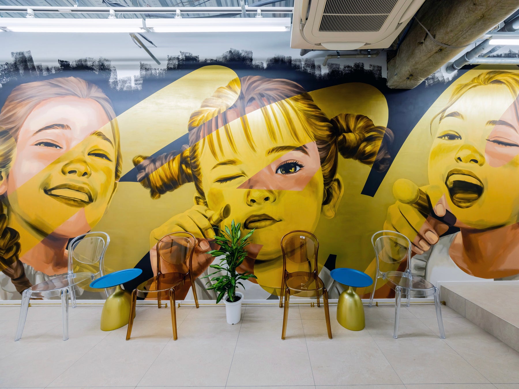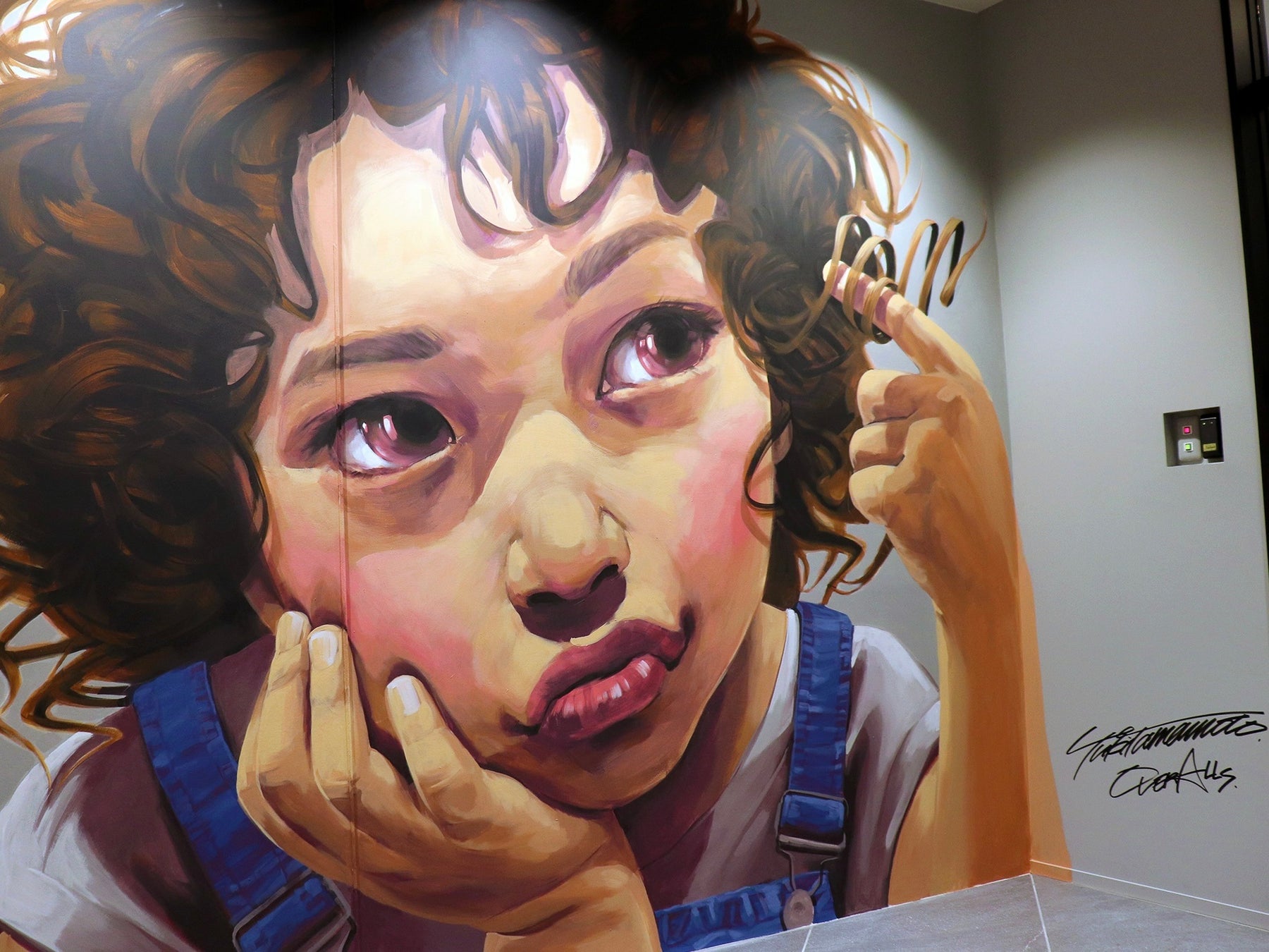 今回のうちの子は、大胆なフラワーのヘッドドレスを纏った子ども。エレベーターの扉が開いた瞬間、まるで花びらがふわりと舞い上がるように、この場所に足を踏み入れたすべての人に「美を楽しむ心」がふっと芽生えるような壁画に仕上げました。