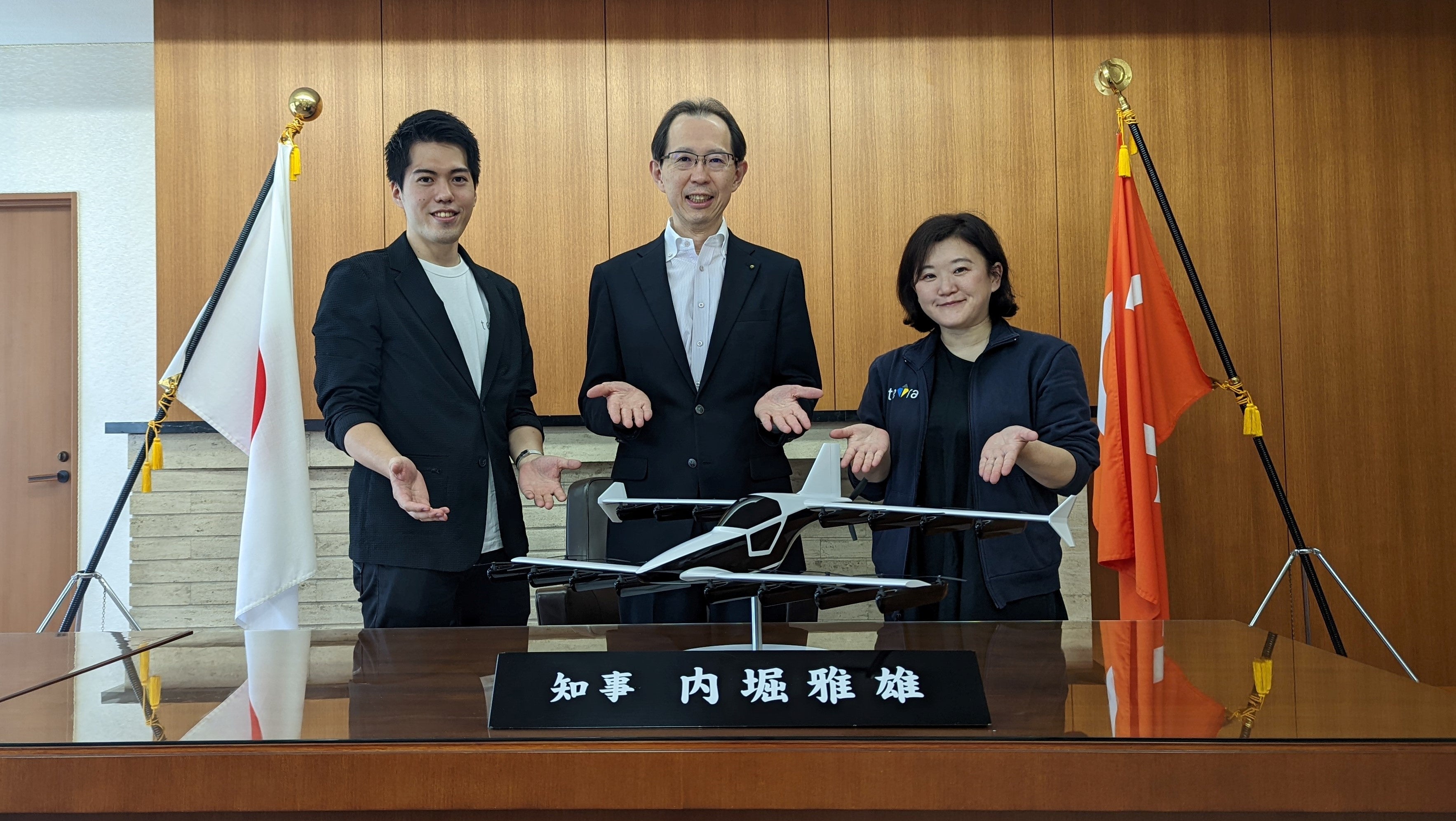 左から、テトラ・アビエーション株式会社代表取締役中井佑、内堀雅雄福島県知事、テトラ・アビエーション株式会社取締役新井秀美