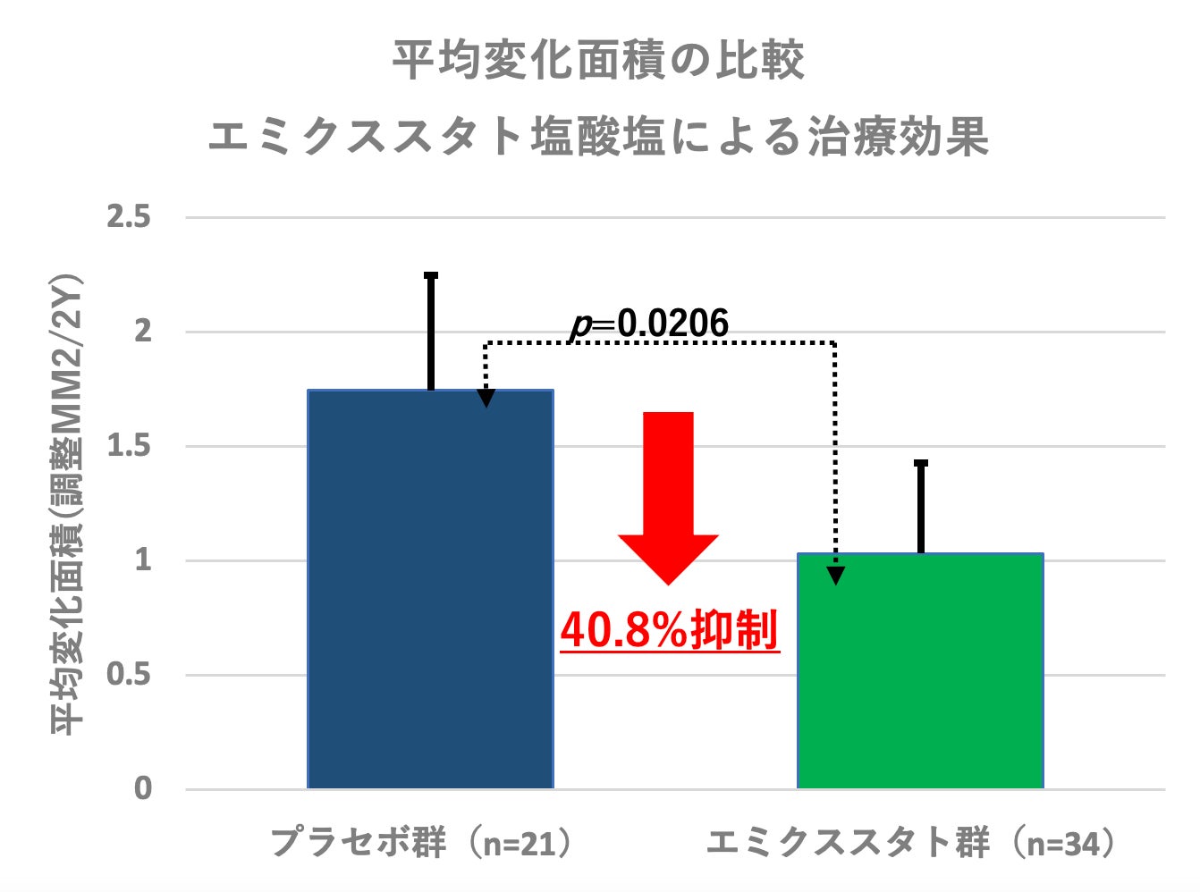 当臨床試験の主要評価項目には、若年性黄斑変性スターガルト病患者において黄斑部の萎縮病巣の進行を抑制する効果の検証が含まれますが、先日発表されたトップラインデータでは、プラセボ投与群と比較したエミクススタト投与群の統計学的な有意性を示す結果が得られませんでした。その後、更なる分析の結果、ベースライン時の萎縮病巣面積(mm2)がより小さい被験者グループでのプラセボ投与群と比較したところ、エミクススタト投与群の萎縮病巣の進行率が優位に低いことを示唆され、それを検証すべく、サブグループ解析(*1)を実施しました。ベースライン時の萎縮病巣領域が小さい被験者グループに対して変数減少法による単変量と多変量分析を行い、このサブグループにおける萎縮病巣の進行に影響する独立したベースラインの因子を特定しました。この解析の結果、エミクススタト投与群の24カ月目の黄斑萎縮の進行率が、プラセボ投与群に比べ40.8%抑制されました(p=0.0206、エミクススタト投与群n=34、プラセボ群 n=21)。