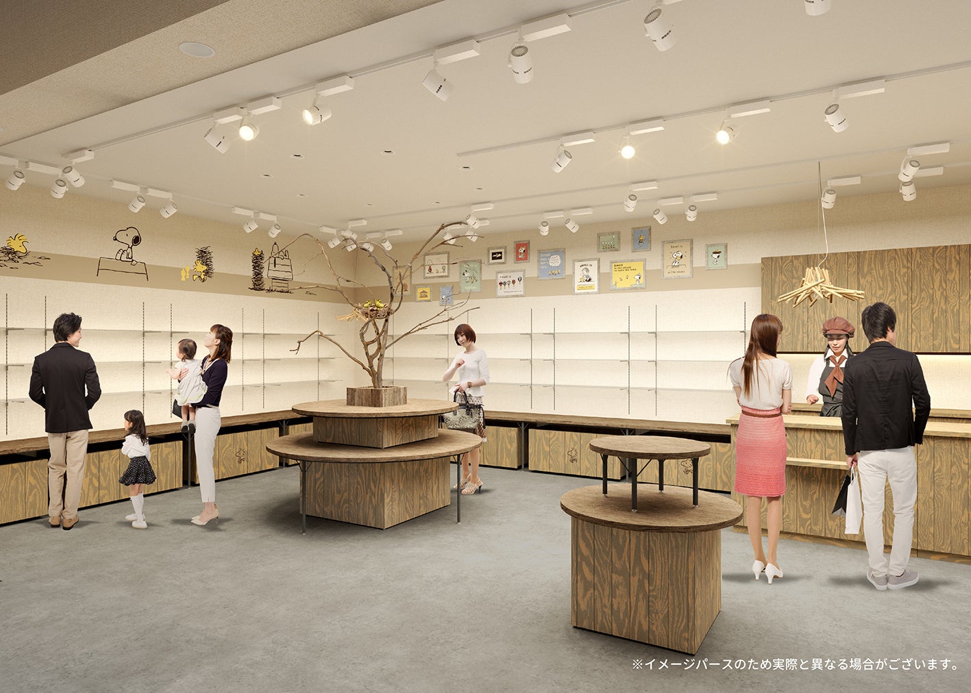 併設のグッズショップでは、「Small is...」のメッセージと愛らしいウッドストックたちをあしらったグッズを多数ご用意しております。