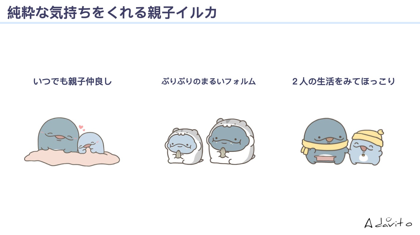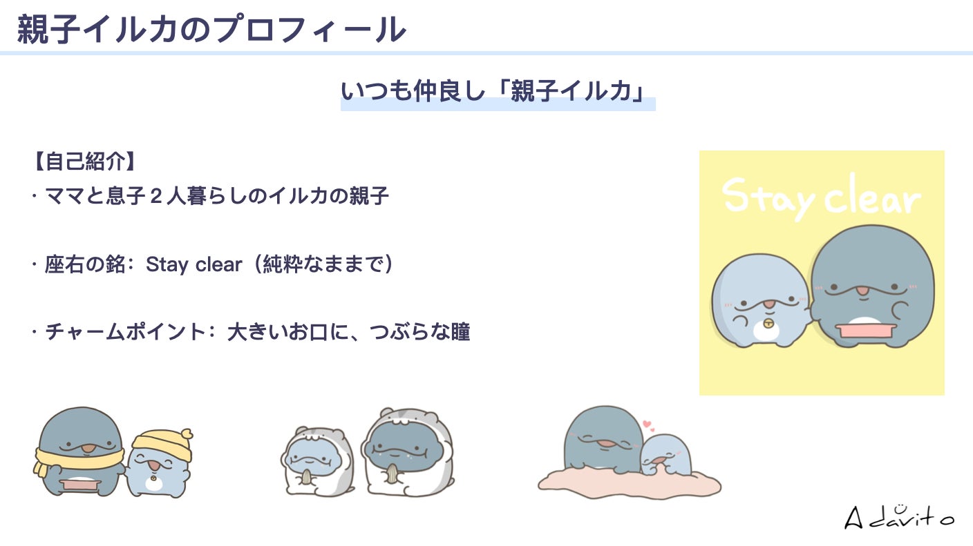 親子イルカは「Stay clear」をコンセプトとして、いつでも仲良しなママと息子の生活を見てほっこりしたり、ぷりぷりのまるいフォルムが魅力となっており、何かとストレスのかかりやすい現代社会において、純粋な気持ちをくれるキャラクタータレントとして、多くの方々に愛されています。